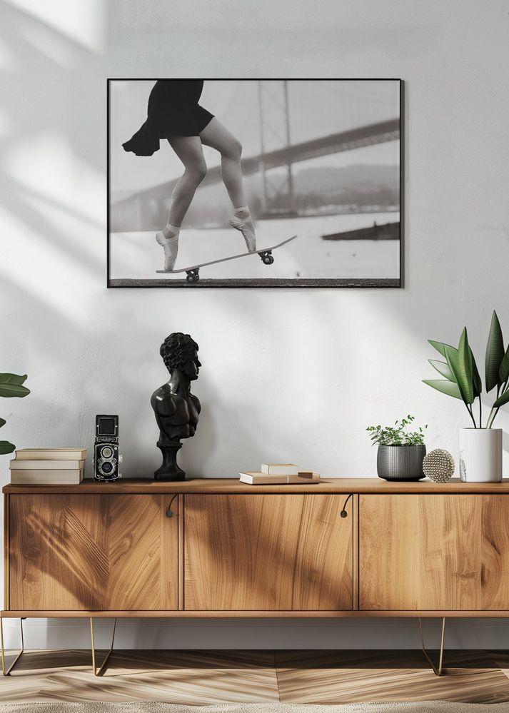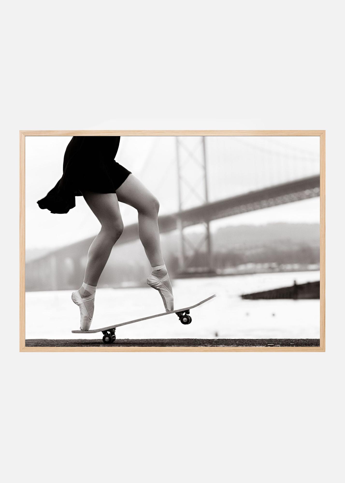 Denna unika poster förenar två världar i en harmonisk balans. Motivet visar en elegant ballerina på tåspetsar som modigt står på en skateboard, vilket skapar en spännande kontrast mellan klassisk grace och urban frihet. Bildens komposition ger en känsla av rörelse och styrka, perfekt för att inspirera och väcka nyfikenhet hos betraktaren. Den är ett utmärkt val för dem som uppskattar modern konst och unika uttryck i sitt hem eller kontor.