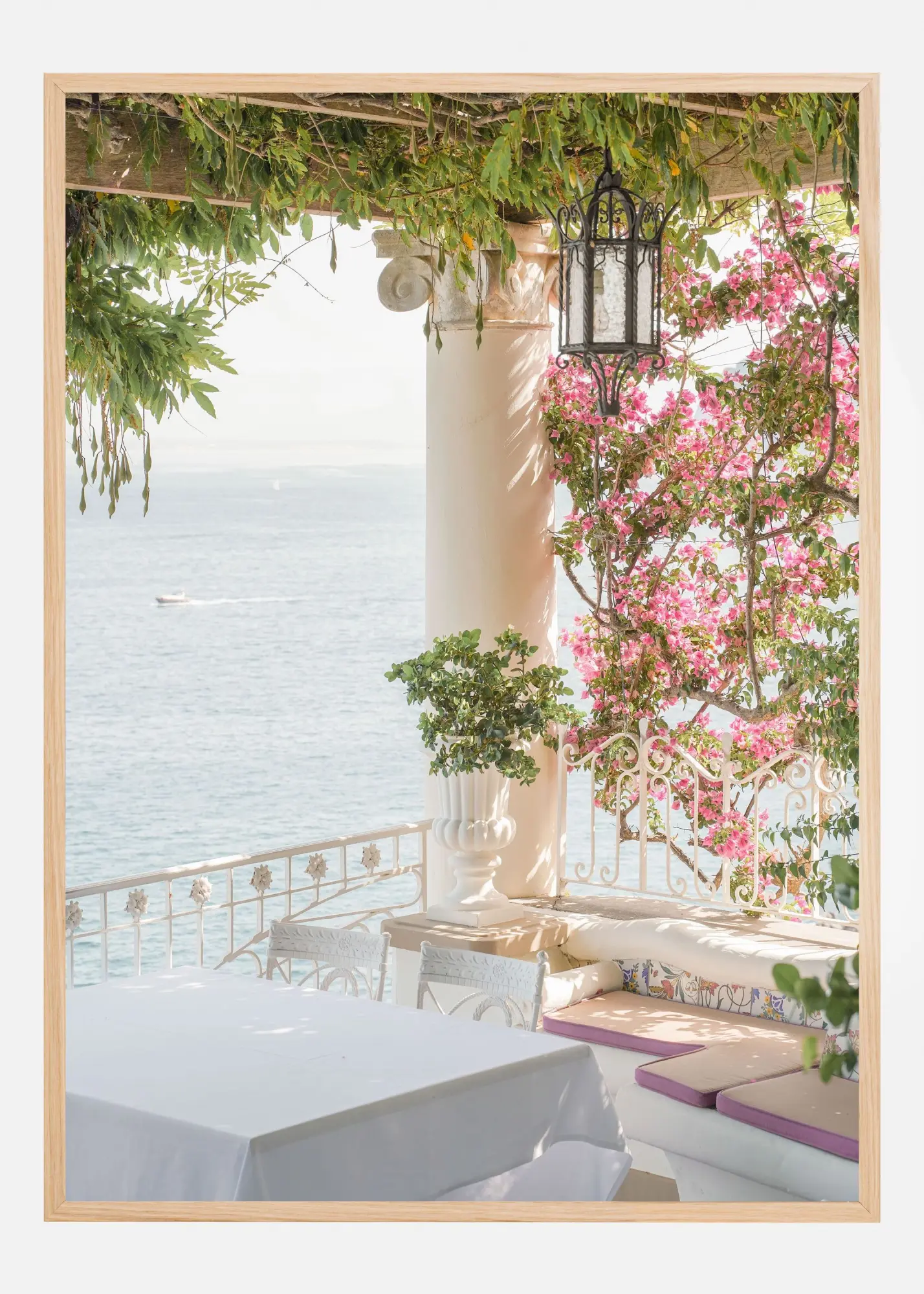 Denna vackra poster fångar en drömsk scen från en solig terrass med utsikt över det glittrande havet. Bilden är fylld av frodig grönska med klättrande växter som skapar en inramning av naturlig skönhet. En elegant lykta hänger från taket som en tidlös detalj. Perfekt för den som vill drömma sig bort till en plats full av frid och inspiration.