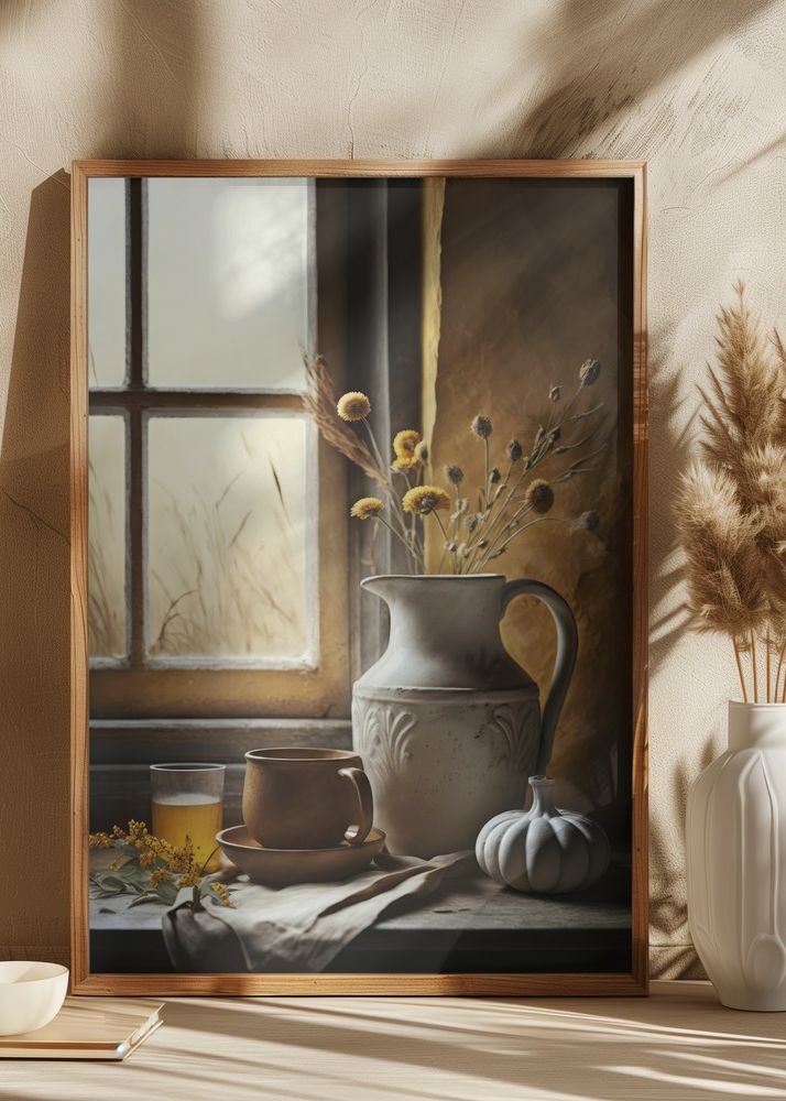 Färgpaletten i denna print domineras av mjuka bruna, varma gula och krämiga vita nyanser. Det naturliga ljuset som strömmar in genom fönstret kastar en behaglig skugga, vilket ger en djup och levande känsla till motivet. Denna poster är ett utmärkt val för den som söker en stilfull och tidlös dekoration som harmonierar med både moderna och traditionella inredningsstilar.