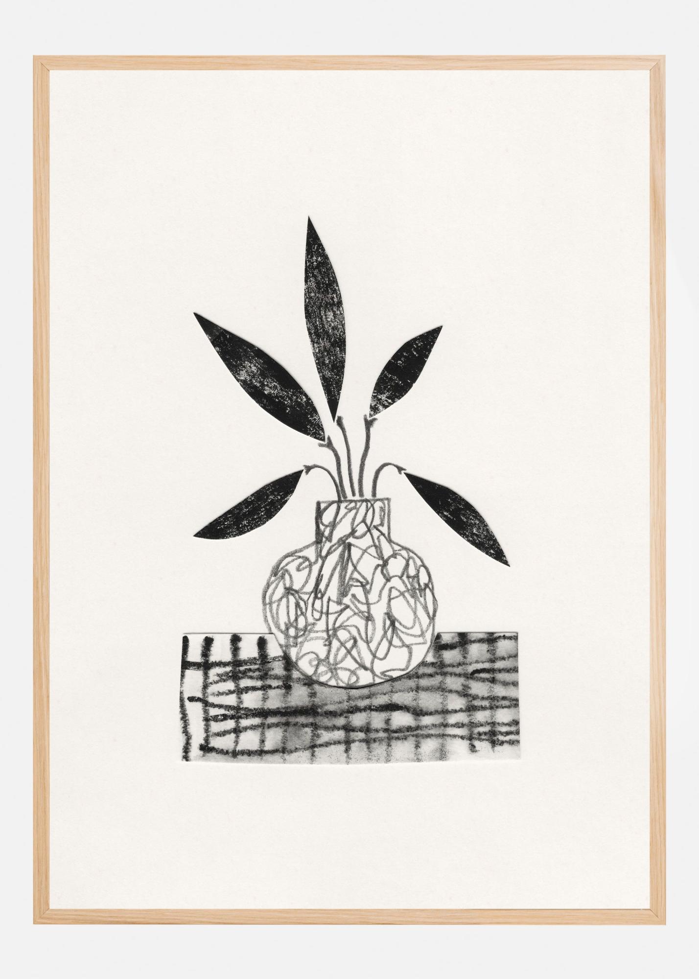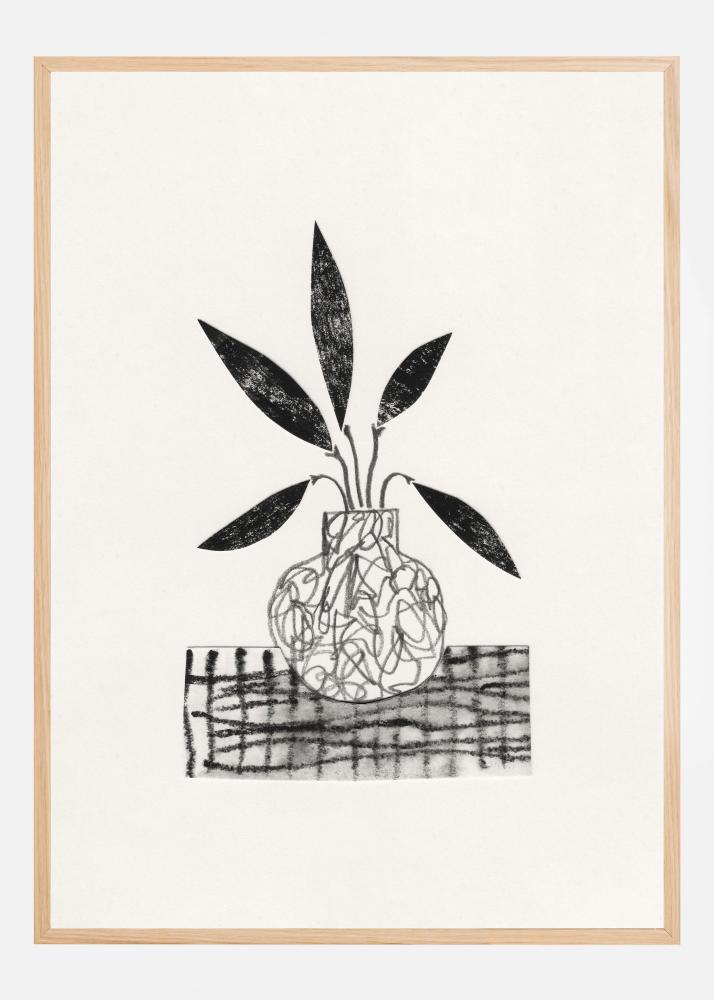 Färgpaletten i printet är begränsad till monokroma nyanser av svart och vitt, vilket gör det lätt att integrera i olika inredningsstilar. De subtila mönstren i vasen tillsammans med växtens löv skapar en harmonisk balans mellan konstnärlig uttrycksfullhet och tidlös design. Välj denna affisch för att förstärka ditt utrymme med en touch av modern konstnärlighet.