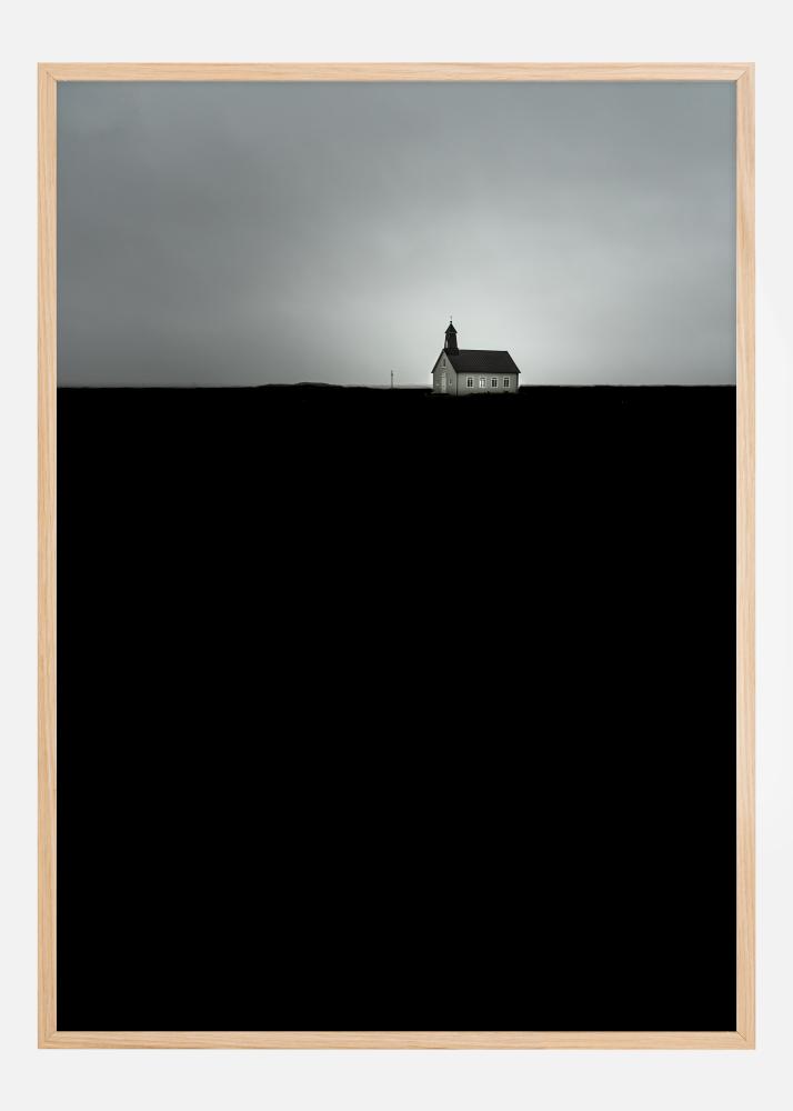 Denna affisch ger en stark och stämningsfull bild av Strandarkirkja, en ensam kyrka som står mot en dramatisk himmel. Den mörka silhuetten av landskapet skapar en skarp kontrast mot den gråa himlen, vilket ger en känsla av isolering och stillhet. Kyrkans vita väggar lyser upp i landskapet, och erbjuder en symbol för hopp och vägledning i den omgivande dunklet.