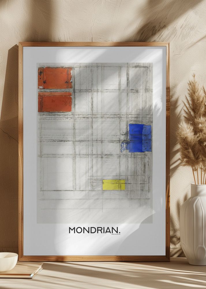 Denna stilrena poster inspirerad av Mondrian fångar uppmärksamheten med sina geometriska former och en tidlös design. Motivet domineras av framträdande färgfält i rött, blått och gult, som skapar en balanserad och harmonisk komposition. De svarta linjerna ger struktur och definition åt motivet, vilket förstärker den modernistiska stilen.