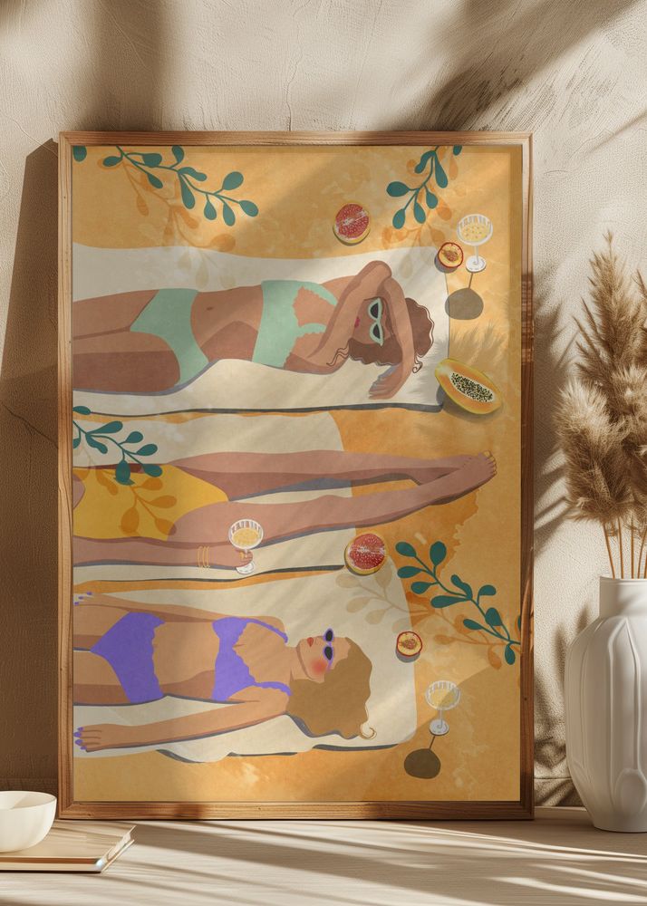 Denna livfulla och trendiga poster skildrar tre personer som ligger och solar i färgglada badkläder. Bakgrunden är en varm gulorange nyans, vilken ger hela affischen en känsla av solig sommar. Runtomkring finns gröna blad och saftig frukt som vattenmelon och apelsiner, vilket förstärker sommarkänslan.