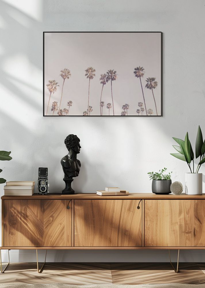 Denna poster fångar känslan av en lugn och solig kalifornisk dag med sina eleganta palmer som sträcker sig mot den öppna himlen. Motivet ger en perfekt känsla av avslappnad strandatmosfär som lätt förvandlar vilket rum som helst till en somrig oas. Palmens säregna siluetter mot den ljusa bakgrunden skapar en harmonisk balans som är både trendig och tidlös.
