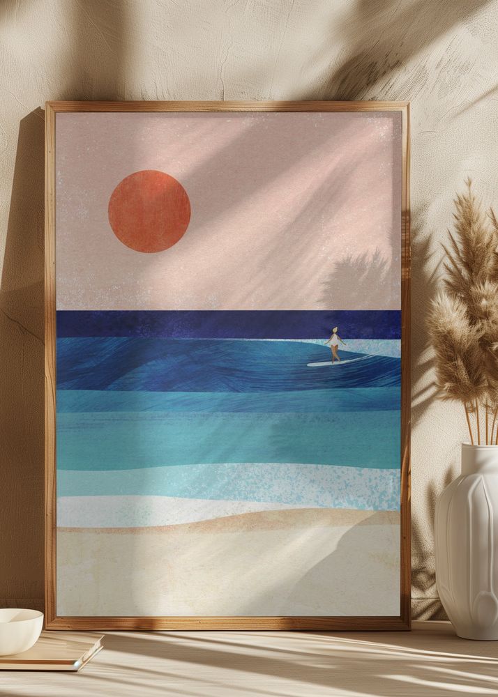 Denna stilrena print fångar en minimalistisk strandscen med en surfare som rider på de djupblå vågorna. Kontrasterna mellan den klara himlen och den stora, orangefärgade solen ger affischen en modern touch, perfekt för att liva upp ditt hem eller kontor. Affischen kombinerar konstnärligt uttryck med enkelhet, vilket gör den till en tidlös dekoration för alla rum.