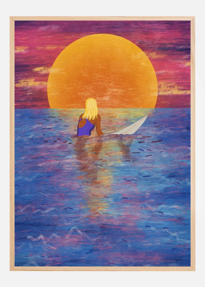 Denna poster fångar en fridfull och inspirerande scen med en surfare som blickar ut över havet mot en storslagen solnedgång. Motivet präglas av en person med blont hår klädd i en blå våtdräkt, som sitter på sin surfbräda i det glittrande vattnet. Havet skimrar i olika nyanser av blått och lila, vilket kontrasterar vackert mot den stora, gyllene solen som är centralt placerad vid horisonten. Solens varma, gula ton skapar en harmonisk balans mot de svalare färgerna i vattnet.