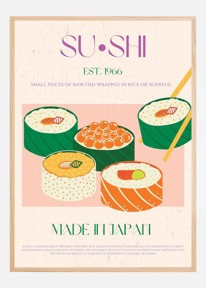 Denna affisch erbjuder en färgstark och stilfull illustration av klassisk japansk sushi. Med en charmig design av olika sushibitar, är den perfekt för att ge ditt hem en smak av östasiatisk kultur. Bildens detaljerade fokus på sushi gör den till en idealisk poster för matentusiaster och dem som älskar den japanska matkulturen. De små bitarna med rå fisk, noggrant lindade i ris eller sjögräs, framstår som konstverk i sig själva.