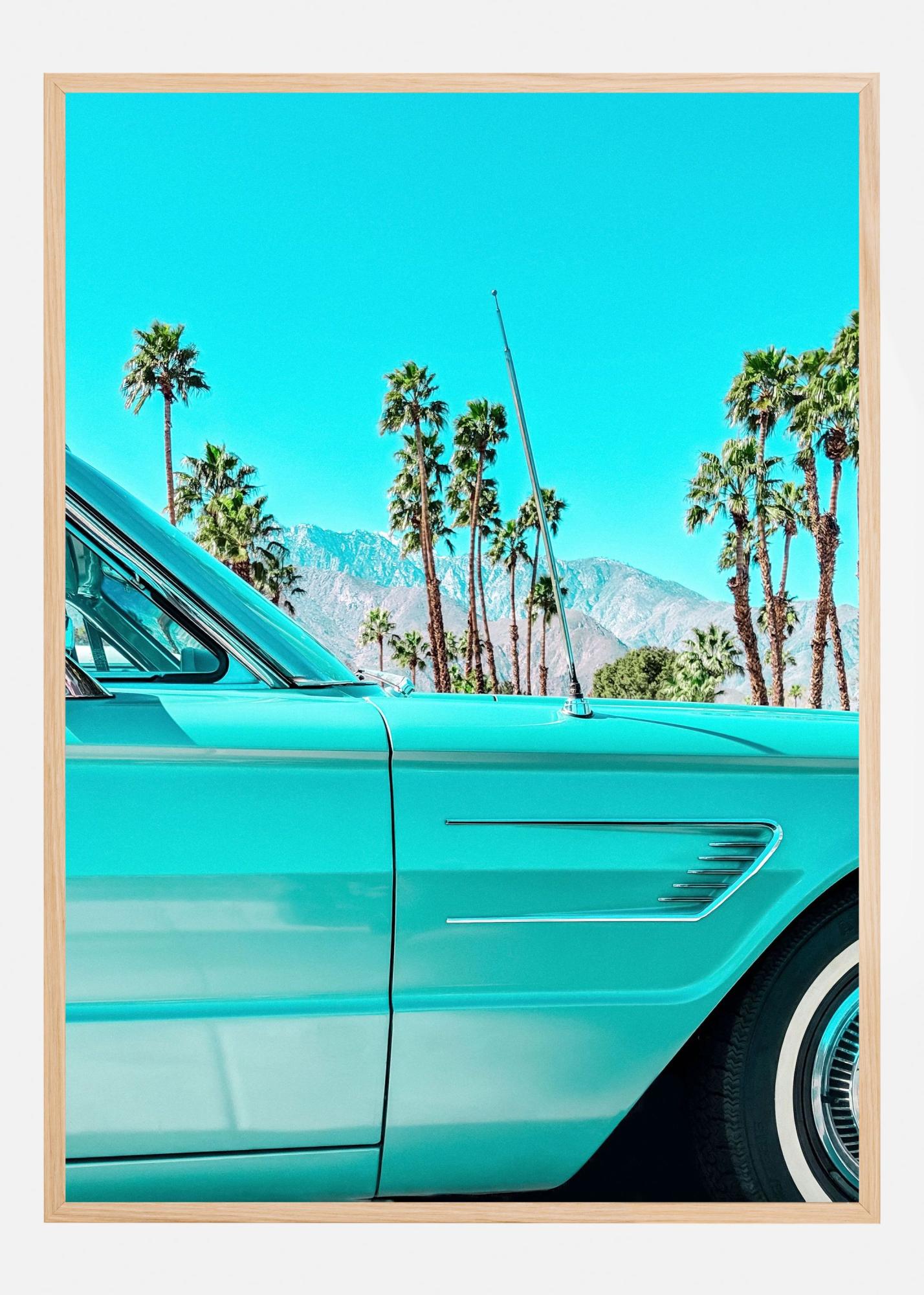 Denna poster fångar essensen av en avslappnad och solig sommardag med ett retroinspirerat motiv. Bilden visar sidan av en tidlös, turkos vintagebil, som framkallar känslor av frihet och nostalgi. I bakgrunden stoltserar ståtliga palmer mot en klarblå himmel, vilket ger en känsla av semester och äventyr. Berget i fjärran tillför ytterligare ett element av naturskönhet och djup.
