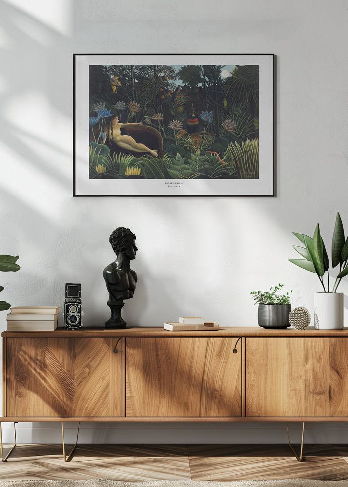 Denna poster föreställer en drömliknande djungelscen med ett lugnt och mystiskt landskap, där en vilande figur avbildas omgiven av frodig grönska och exotiska växter. Djungeln sträcker sig djupt in i bakgrunden och skapar en känsla av äventyr och stillhet. Prints som denna bjuder in betraktaren till en fantasifull värld, perfekt för att ge vilket rum som helst en samtida och elegant känsla.