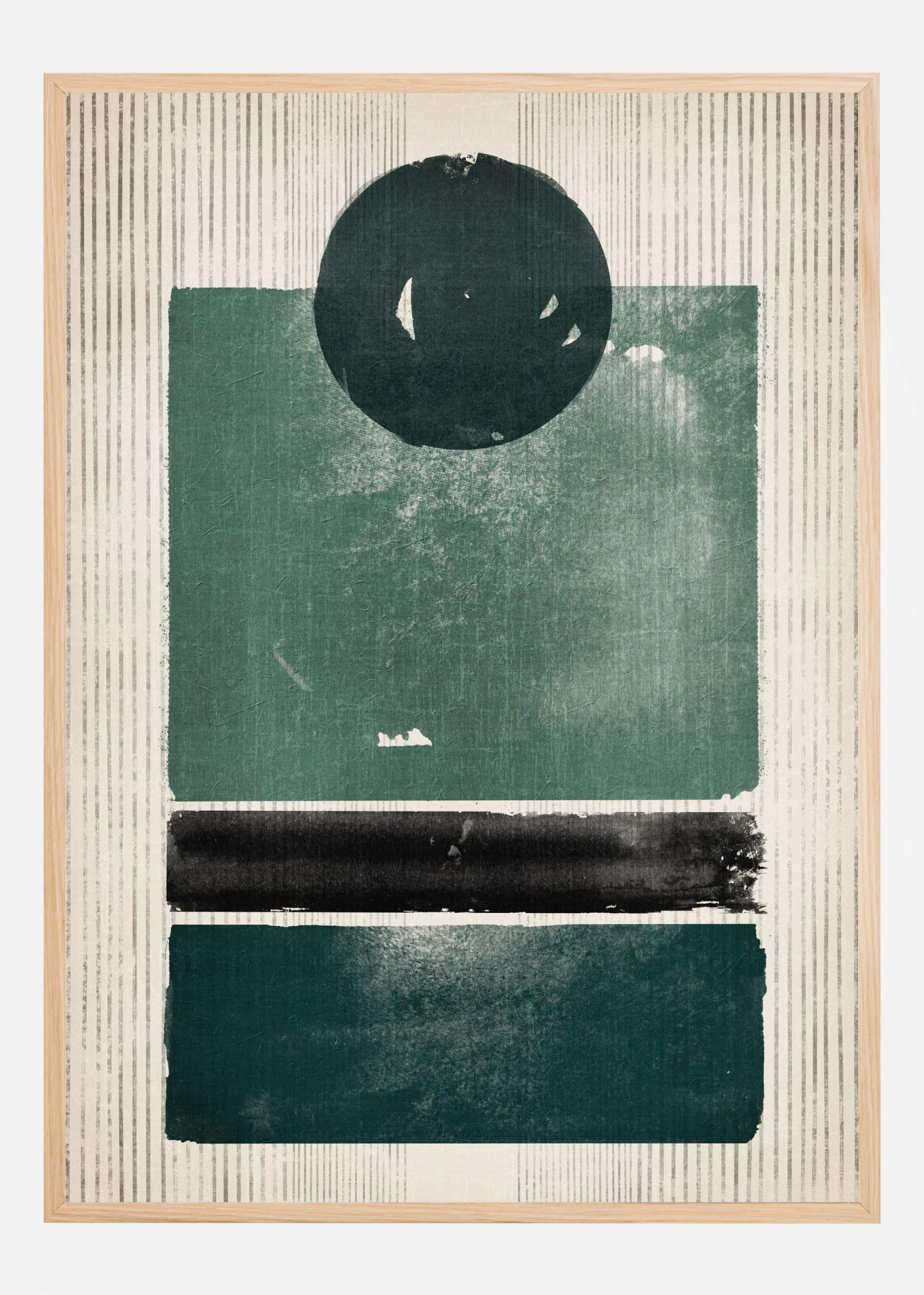 Färgpaletten på denna affisch domineras av olika nyanser av grönt, från den mörkgröna cirkeln till den mer dämpade gröna rektangeln, i kombination med en slående svart linje. Den tryckta effekten förstärker den konstnärliga känslan, vilket gör det till ett utmärkt val för att liva upp vilket rum som helst med en modern och stilren estetik. Denna print erbjuder en perfekt blandning av enkelhet och visuell dynamik.