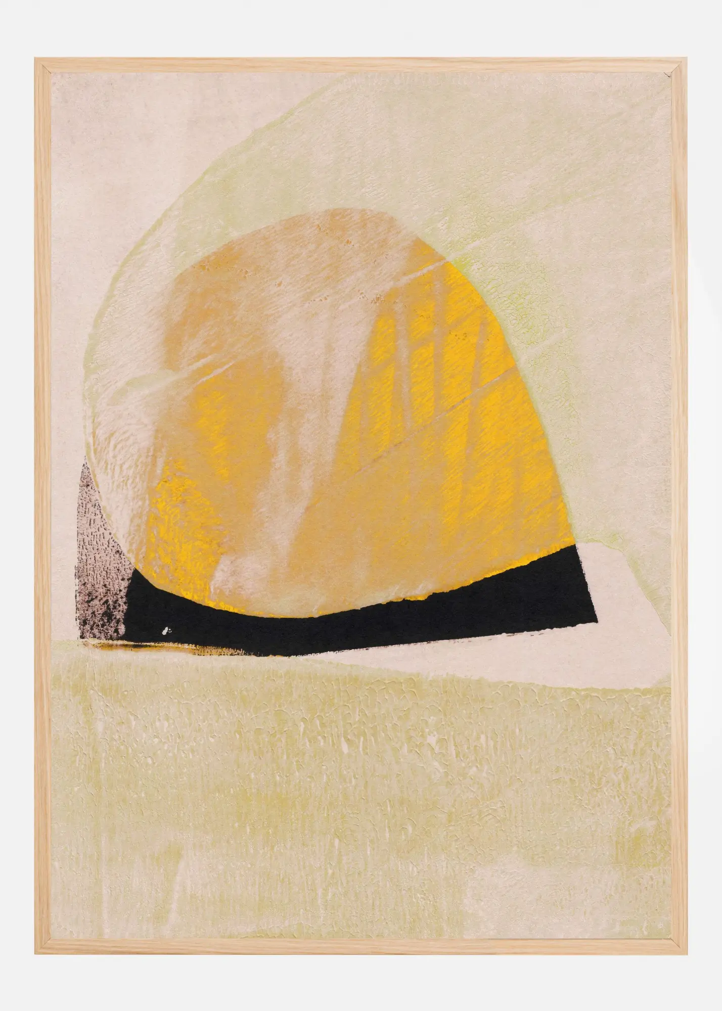 Denna abstrakta affisch fångar ögat med sina mjuka och organiska former som skapar en intressant dynamik. Motivet domineras av en stor, välvd form i en varm guldgul nyans, vilket ger postern en levande mittpunkt. De omgivande tonerna är dämpade och jordnära, vilket inkluderar varierande nyanser av beige och ljusgrönt som framhäver motivets textur och djup.
