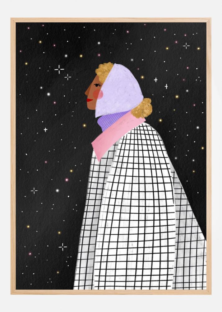Denna unika poster föreställer ett konstnärligt motiv av en stiliserad person mot en stjärnbeströdd svart bakgrund. Personen är klädd i en svartvitrutig rock och bär en ljuslila huvudbonad, vilket ger en intressant och färgstark kontrast. Ansiktet är målat i jordnära toner och kragen på rocken pryds av en rosa detalj, vilket ger ytterligare djup och intresse till affischen.