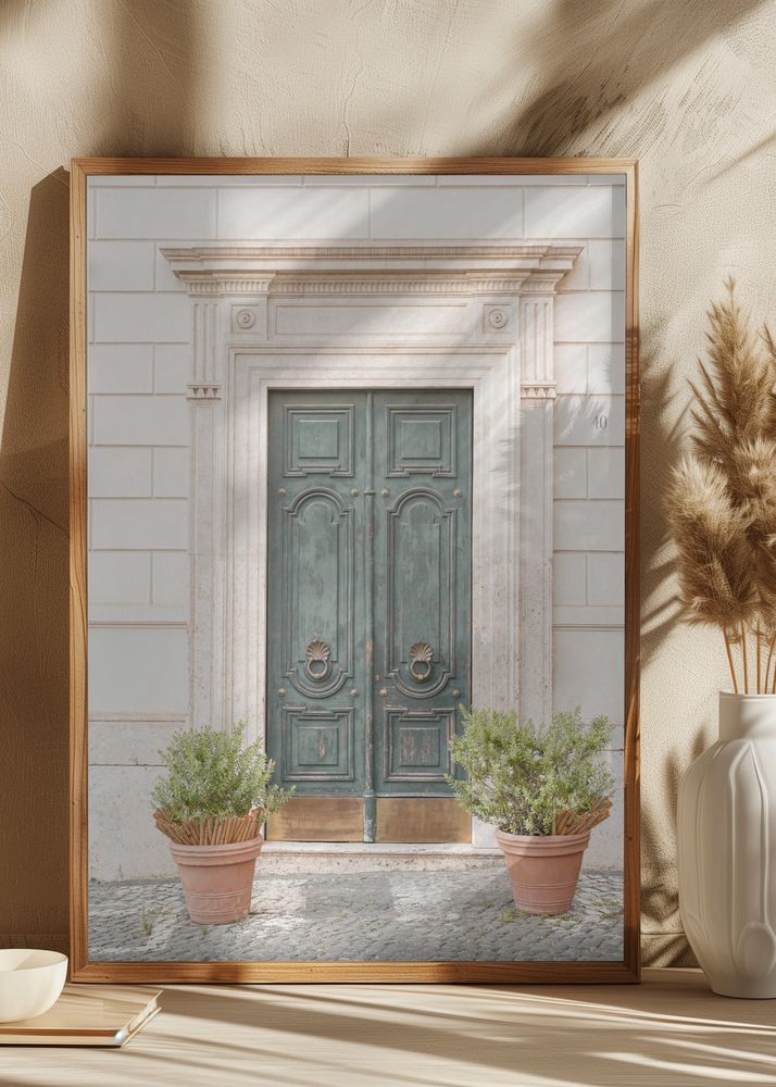 Motivet har en ljus och neutral bakgrund med toner av beige och grått, vilket framhäver dörrens gröna nyans och det varma terrakottatonen i krukorna nedanför. De gröna växterna i krukorna tillför liv och energi till denna print och skapar en harmonisk balans mellan arkitektur och natur. Denna affisch är idealisk för att komplettera moderna eller klassiska inredningsstilar.