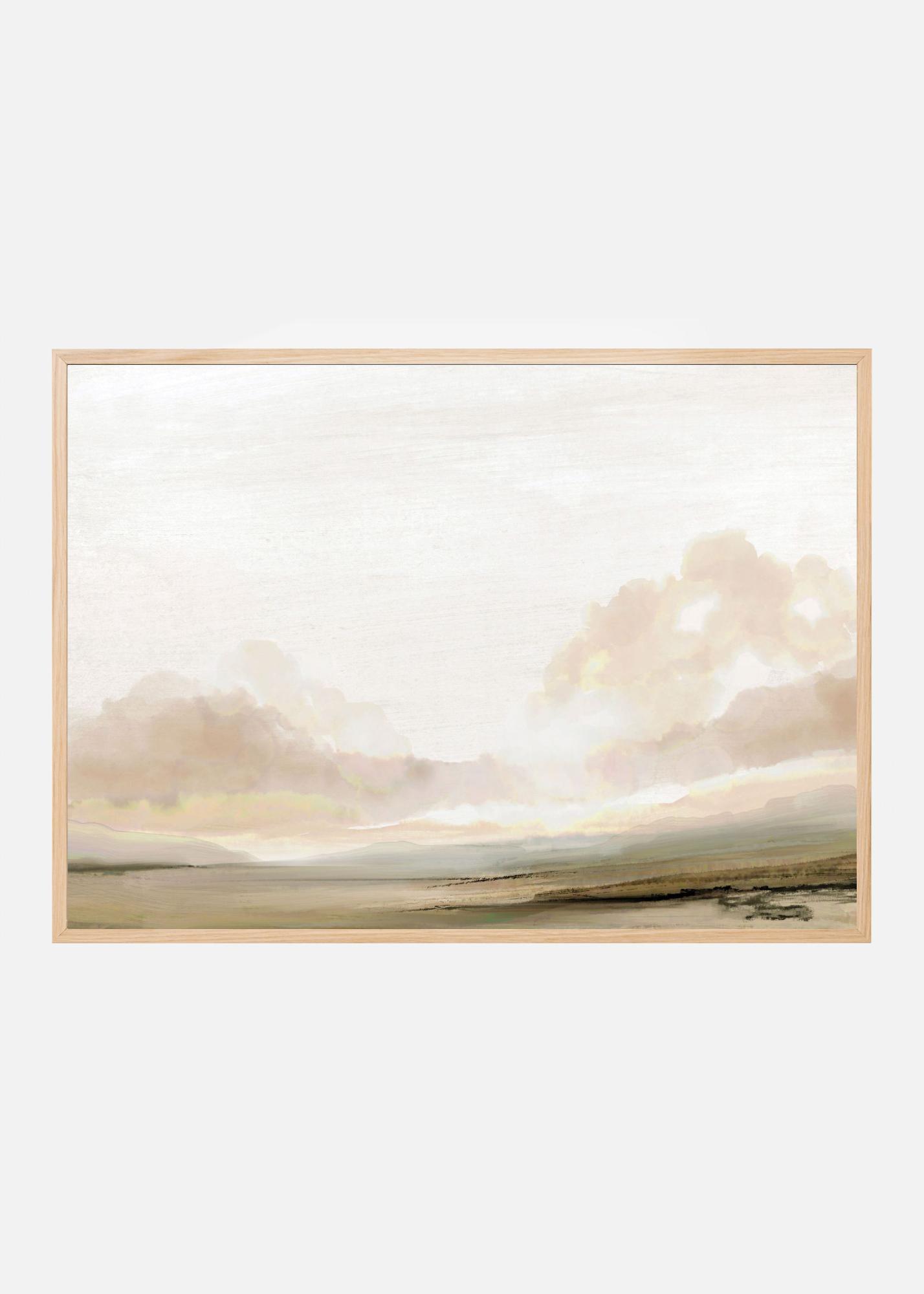 Denna eleganta poster fångar essensen av ett drömlikt landskap, perfekt för att skapa en lugn och harmonisk stämning i ditt hem. Motivet visar ett vidsträckt landskap med subtila nyanser som ger ett mjukt och inbjudande intryck. Färgpaletten domineras av mjuka beige och bruna toner, ackompanjerade av skira inslag av vitt och grått som skimrar i motivets moln.