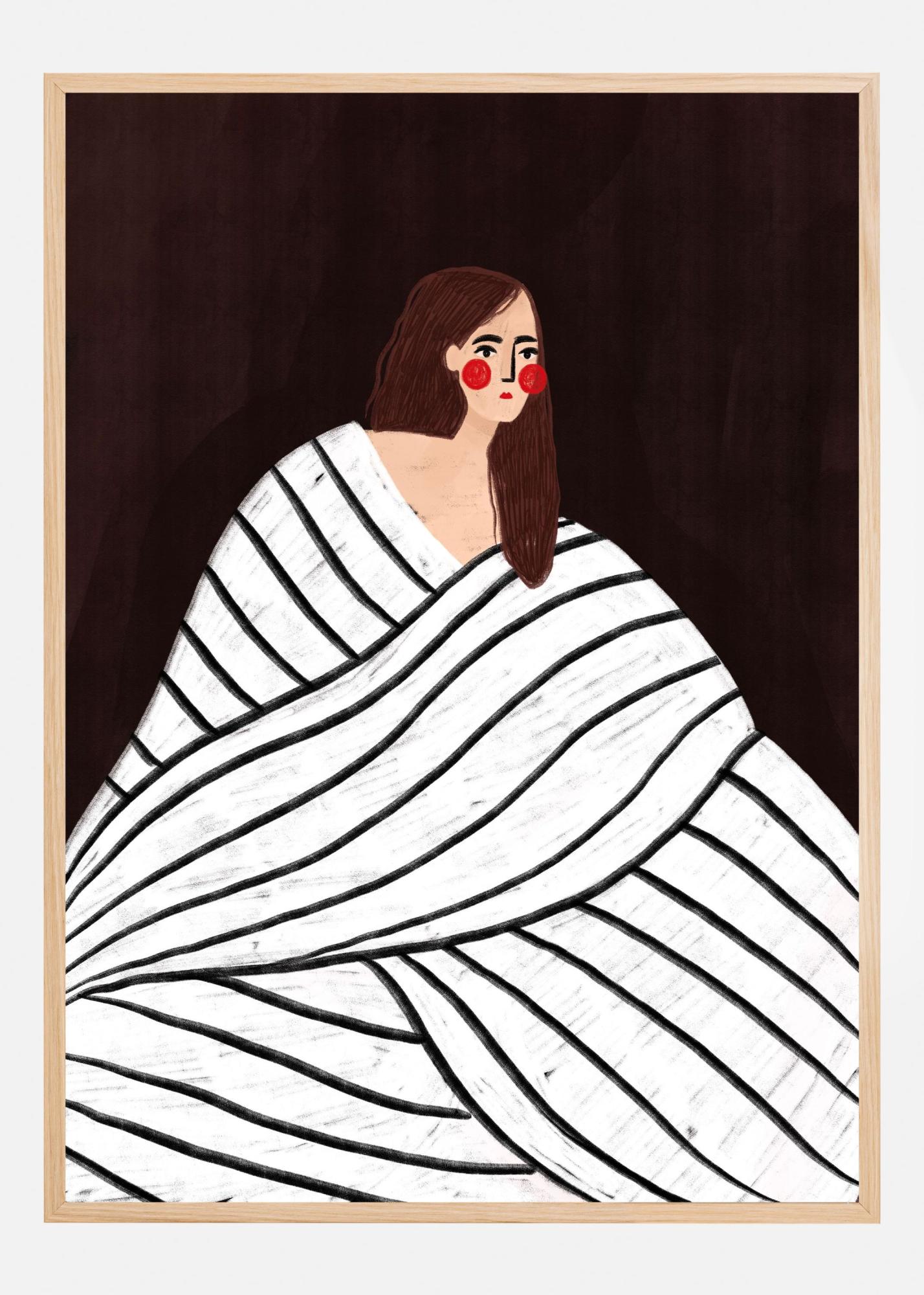Denna konstnärliga poster fångar essensen av modern minimalism med en drömlik och uttrycksfull figur. Bilden föreställer en kvinna insvept i ett geometriskt mönstrat tyg, vilket ger en känsla av både skydd och frihet. Ansiktet utstrålar känslor på ett subtilt sätt som bjuder in till reflektion och tolkning. Perfekt för att lyfta vardagsrummet, sovrummet eller arbetsplatsen med sin unika och samtida design.