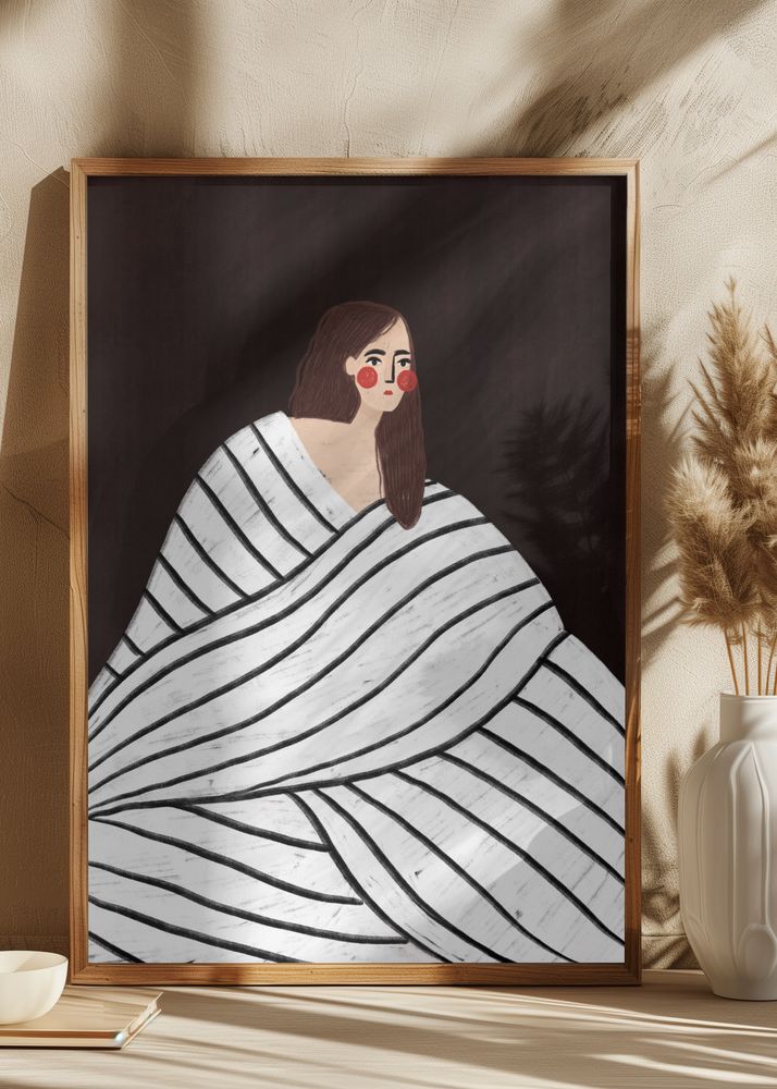 Denna konstnärliga poster fångar essensen av modern minimalism med en drömlik och uttrycksfull figur. Bilden föreställer en kvinna insvept i ett geometriskt mönstrat tyg, vilket ger en känsla av både skydd och frihet. Ansiktet utstrålar känslor på ett subtilt sätt som bjuder in till reflektion och tolkning. Perfekt för att lyfta vardagsrummet, sovrummet eller arbetsplatsen med sin unika och samtida design.