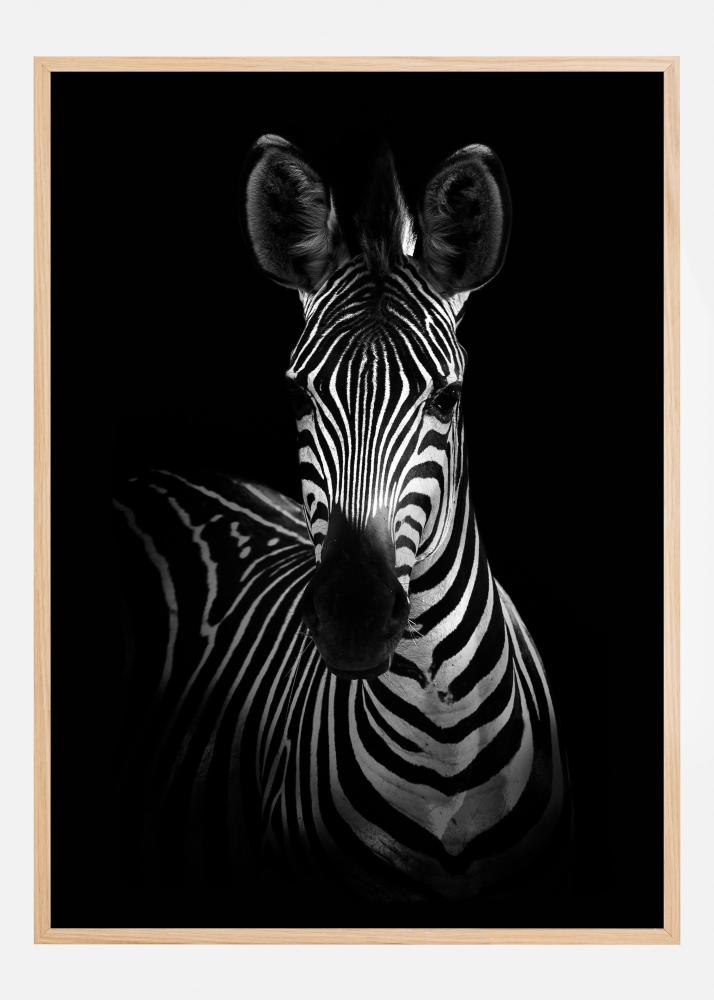 Denna poster fångar elegansen hos en zebra i ett dramatiskt svartvitt motiv. Zebrans karakteristiska ränder framhävs mot en djup svart bakgrund, vilket ger en tidlös och sofistikerad känsla. Detta print passar perfekt i både moderna och klassiska inredningsstilar och kan bli en stilren detalj i ditt hem.