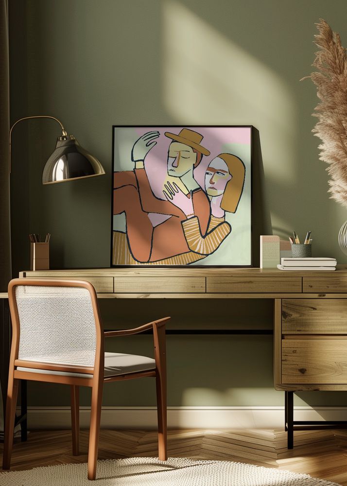 Denna unika affisch fångar en modern och abstrakt stil med två stiliserade figurer som ger verket en känsla av både intimitet och mystik. Postern visar en harmonisk balans mellan linjer och former, vilket ger utrymme för både fantasi och tolkning. Perfekt för den som vill tillföra en konstnärlig och samtida touch till sitt hem eller kontor.