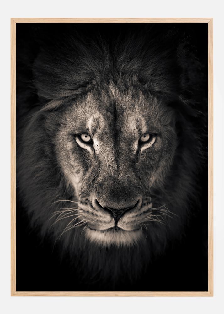 Denna kraftfulla och gripande poster fångar en lejons djupa blick, vilket ger en känsla av dess styrka och närvaro. Den svartvita toningen ger bilden en tidlös kvalitet och framhäver lejonets majestätiska drag och den intensitet som finns i dess ögon. Det är en print som utstrålar auktoritet och det vilda, en idealisk representation av 'djungelns kung'.