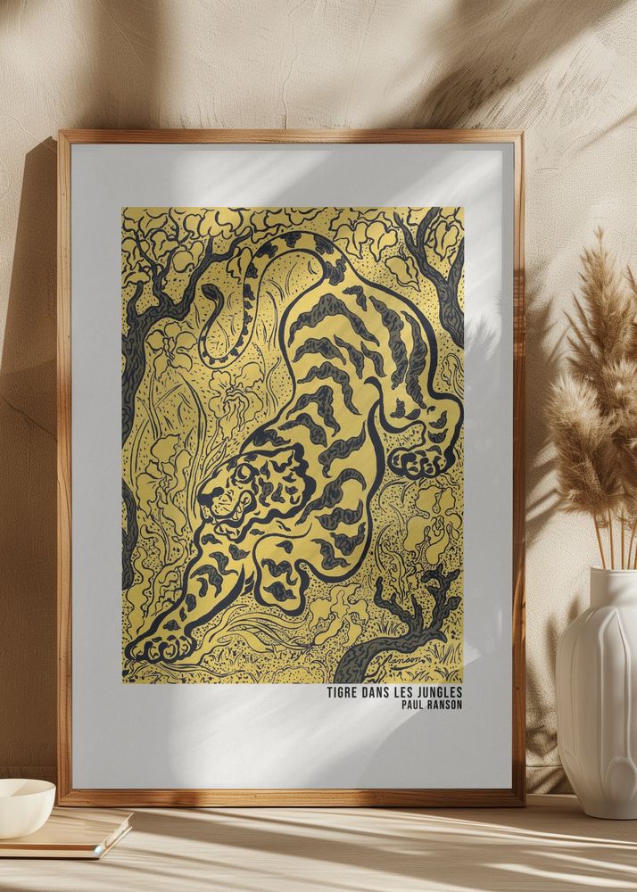 Denna poster visar ett konstnärligt motiv föreställande en tiger som smidigt rör sig genom en detaljrikt avbildad djungel. Motivet är inspirerat av en harmonisk sammansmältning av natur och vilddjurets styrka, vilket gör det till en unik och elegant dekorationsdetalj. Passar perfekt som affisch för både moderna och klassiska inredningsstilar.