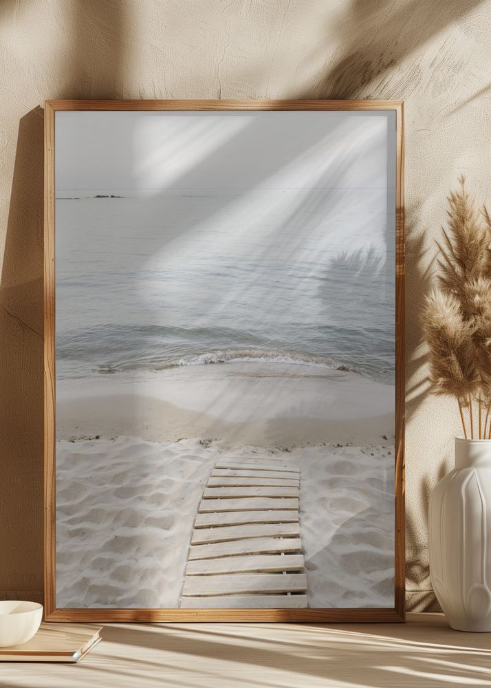 Denna vackra poster fångar essensen av en lugn stranddag, med en träpromenad som leder ner till havet. Denna print kommer att ge ditt hem en känsla av ro och sommar, perfekt för att skapa en avkopplande atmosfär. Motivets enkelhet framhäver det naturliga landskapet, vilket gör att denna affisch passar in i många olika inredningsstilar.
