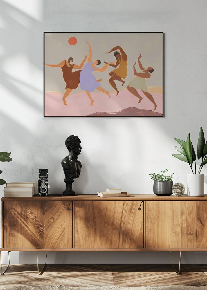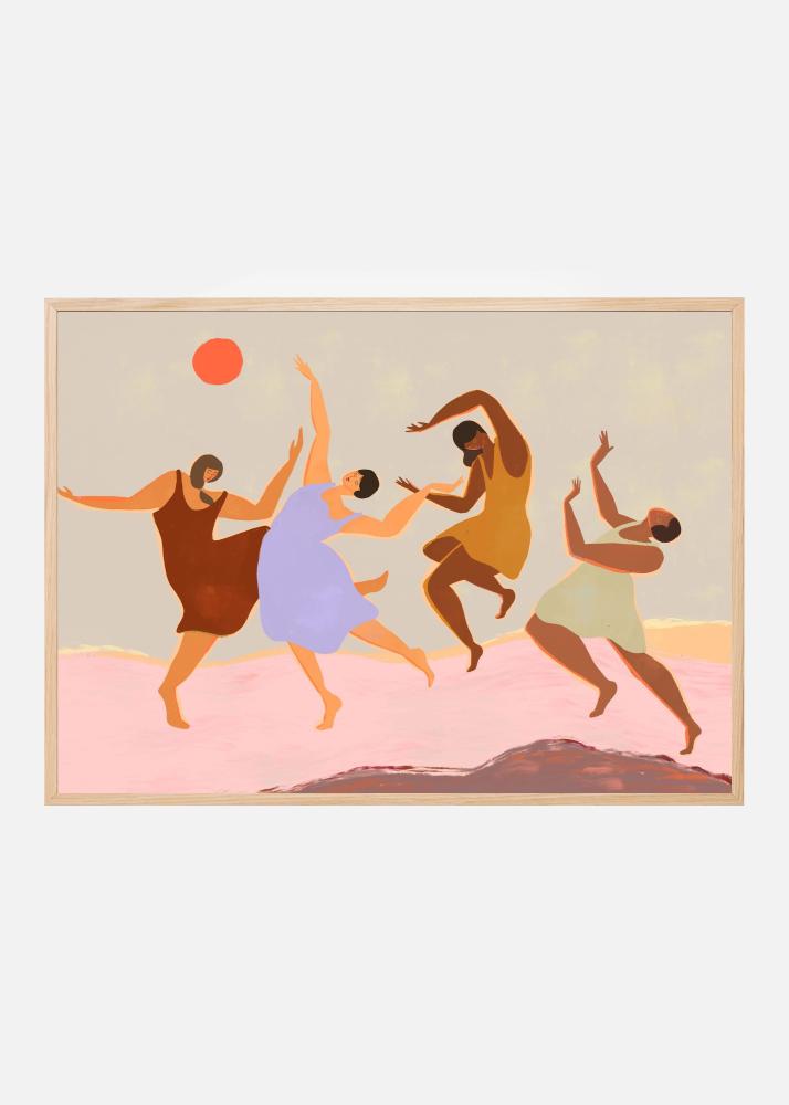 Denna färgglada affisch fångar rörelsen och glädjen hos dansande figurer, vilket gör den till en energifull och livlig poster som kan lysa upp vilket rum som helst. De dansande gestalterna har olika jordnära och varma färger såsom brunt, gult och beige, medan en figur är klädd i en lila ton. En röd sol balanserar kompositionen och tillför en extra dimension av dynamik. Bakgrunden är en mjukt tonad pastell i rosa som skapar en harmonisk kontrast mot de djärva figurerna.