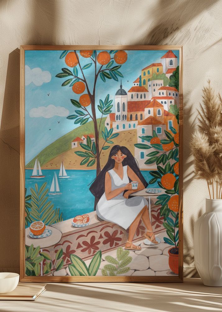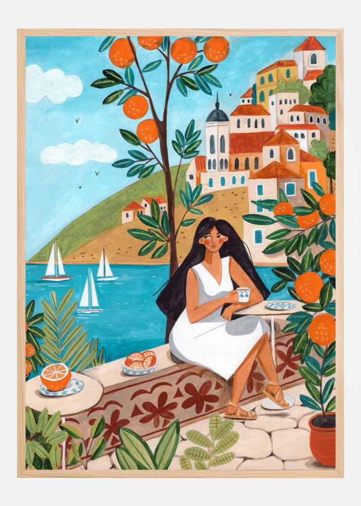 Den här poster fångar en idyllisk medelhavsscen med en avslappnad atmosfär. Bilden visar en kvinna i vit klänning som njuter av sin dag vid kustens kant, omgiven av frodiga apelsinträd. I bakgrunden syns en pittoresk by med färgglada hus, vilket ger en charmig och inbjudande känsla. Denna print är perfekt för att ge ditt rum en touch av somrig medelhavsstil.