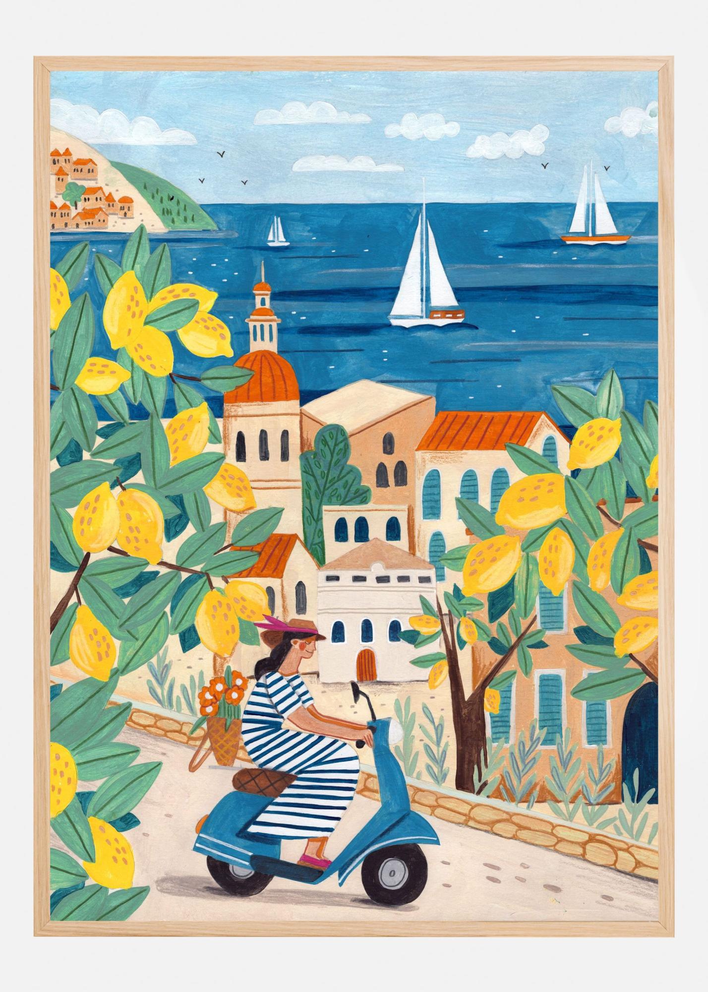 Affischen präglas av ljusa och glada färger som gula citroner, en klarblå himmel och hav, samt jordnära toner av beige och terrakotta på husen. Detaljer som segelbåtar i horisonten och det gröna lövverket bidrar till en känsla av lugn och upptäcktsglädje. Perfekt som en färgklick i ditt vardagsrum eller som en inspirerande del av din inredning.
