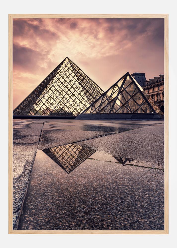 Denna moderna poster avbildar de ikoniska geometriska formerna av en berömd struktur, som speglas i en pöl av vatten. De metallskenande trianglarna och glaspanelerna fångas i ett djärvt perspektiv, med en himmel målad i mjuka nyanser av lila och rosa som skymningens sista ljus. Färgpaletten sträcker sig från kalla grå och silvertoner till varma koppartoner, vilket reflekterar både konstruktionens hållbarhet och himmelens förgängliga skönhet.