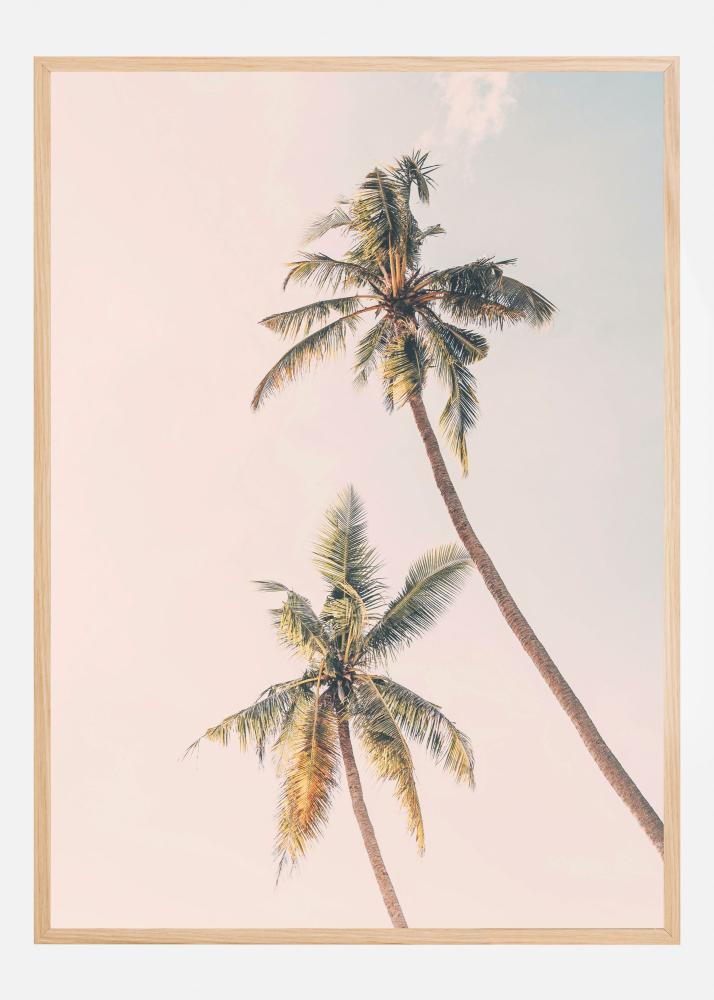 Denna poster fångar en lugn och somrig känsla med två majestätiska palmer som sträcker sig mot en ljus himmel. Motivet har en avslappnande atmosfär som tar dig till tropiska breddgrader och ger en känsla av semester och frihet.