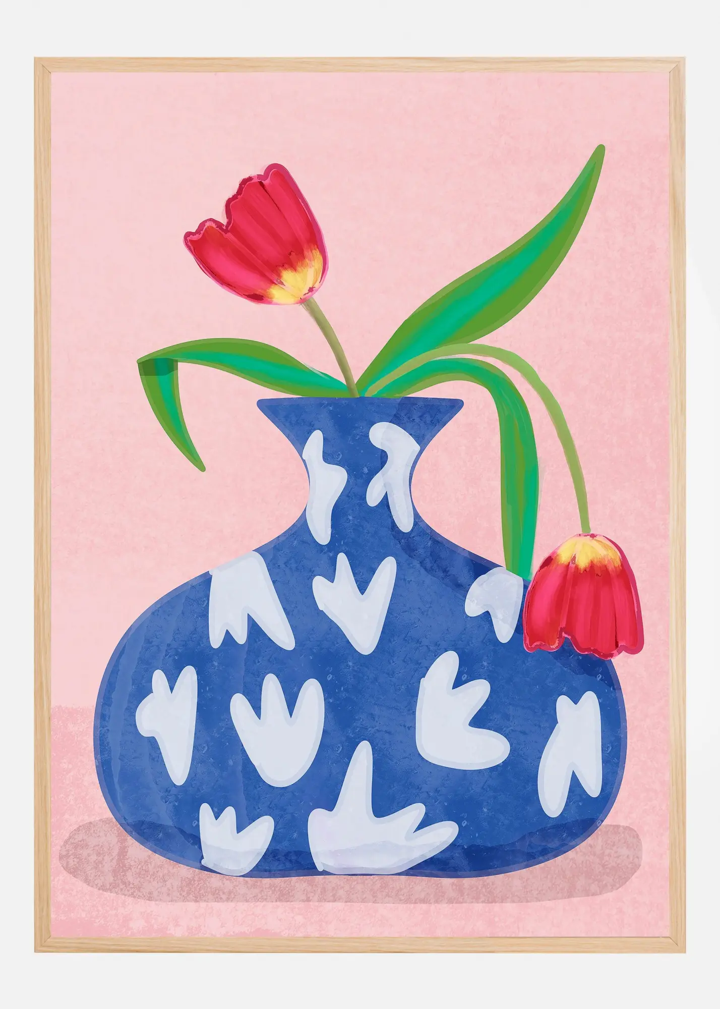 Upptäck en trendig poster med ett färgglatt och konstnärligt motiv som förgyller vilket rum som helst. Denna affisch visar en charmig vas i djupblå färg prydd med abstrakta vita mönster, vilket ger en unik touch. Vasen är smakfullt fylld med två kuddlika tulpaner i klarrött och ljusrosa, vilket skapar en vacker kontrast och livfullhet.