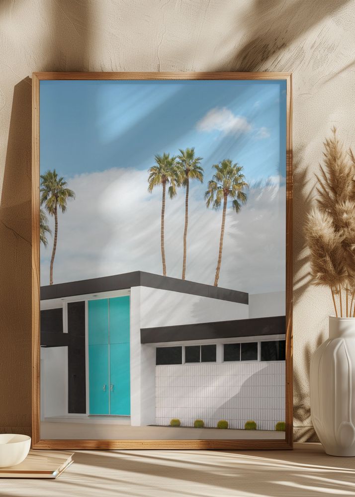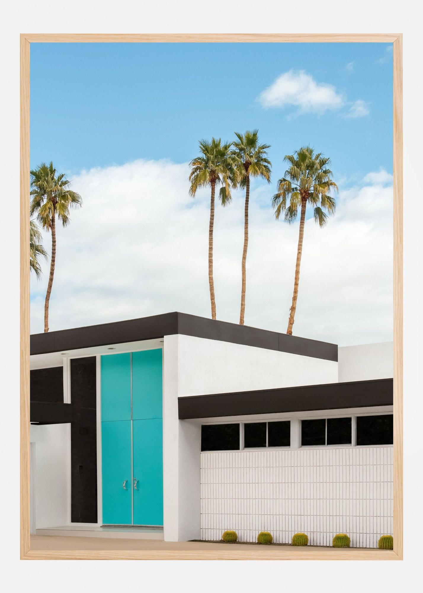 Denna trendiga poster fångar essensen av modern arkitektur med en stilren och minimalistisk design. Motivet visar en vit byggnad med en iögonfallande turkos dörr, omgiven av höga, slanka palmer som sträcker sig mot den klarblåa himlen. Denna print passar perfekt för den som vill addera en touch av modern stil och färg till sitt hem.