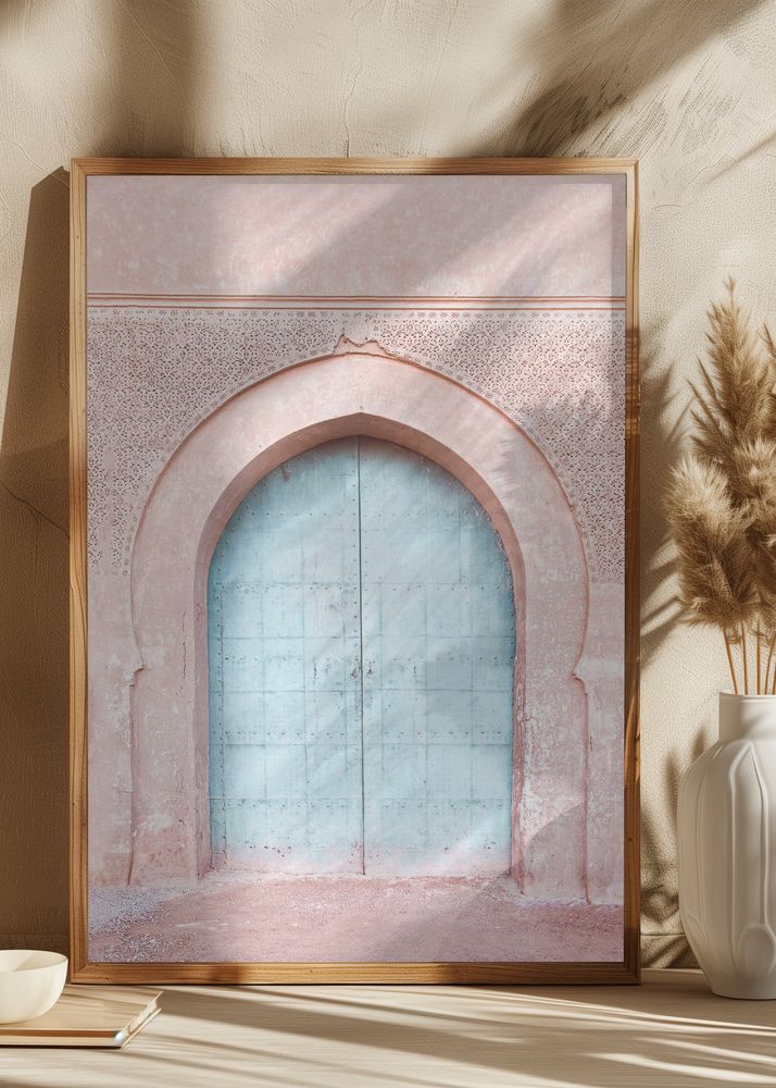 Denna poster fångar skönheten hos en gammal arkitektonisk dörr, framhävd med mjuka pastellfärger. Motivet visar en elegant båge i varma nyanser av rosa, vilket ger en tidlös och lugn känsla. Den subtilt dekorerade muren bidrar till motivets unika karaktär och detaljer.
