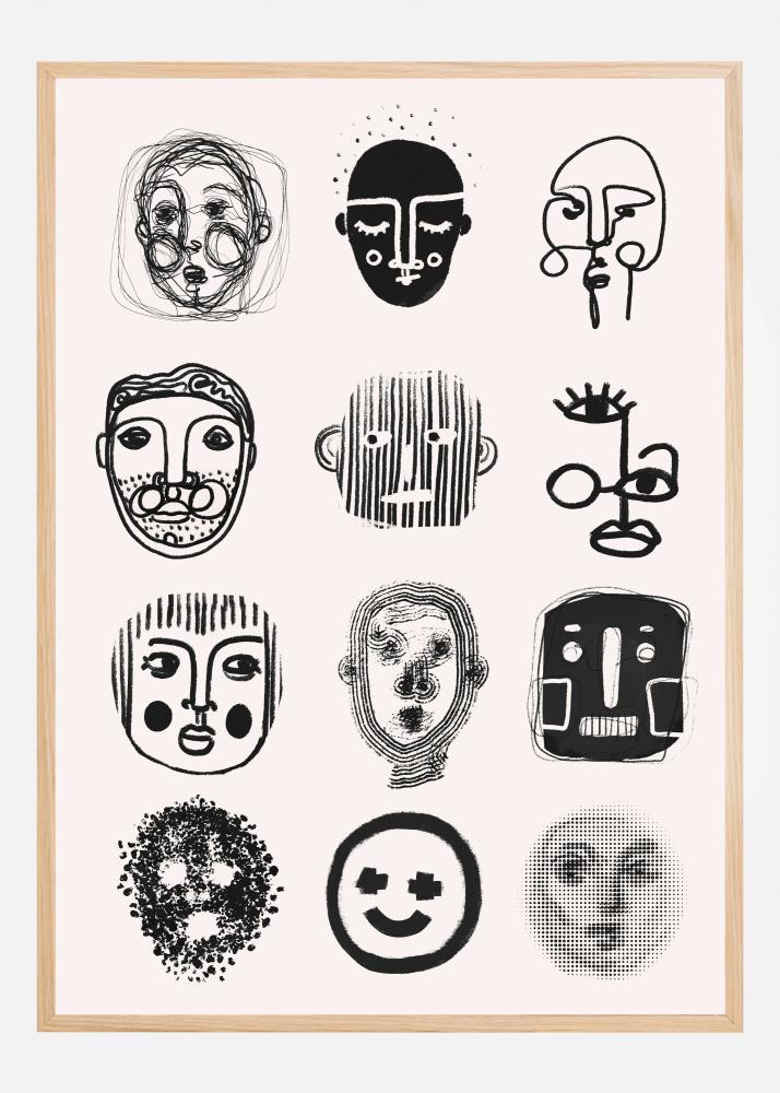Denna poster är en expressionistisk hyllning till minimalistiska porträtt med svartvita linjeteckningar. Varje ansikte erbjuder en unik tolkning av mänskligt uttryck, vilket skapar en fascinerande samling av konstnärliga figurer. Detta print är perfekt för den som uppskattar modern konst och stilren inredning. Använd den gärna som en samtalsstartare eller som en stilfull detalj i ditt hem.
