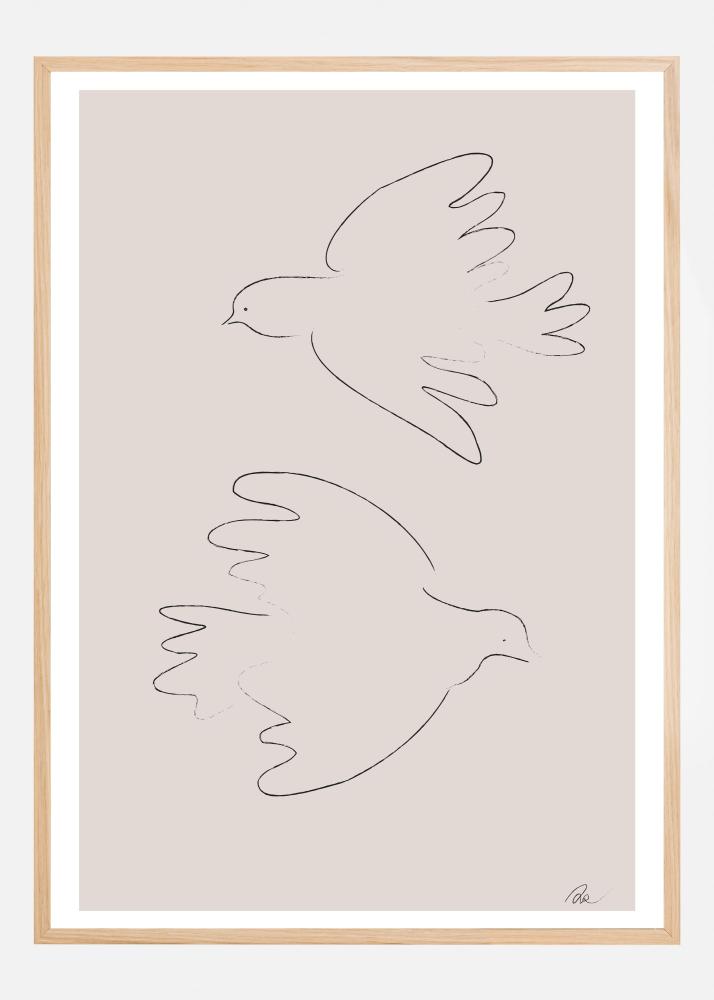 Denna eleganta poster visar ett stilrent motiv med två fåglar som verkar sväva genom luften. Konturerna av fåglarna är konstnärligt skissade, vilket ger ett minimalistiskt och modernt intryck. Perfekt som affisch för att skapa en lugn och harmonisk atmosfär i hemmet eller på kontoret.