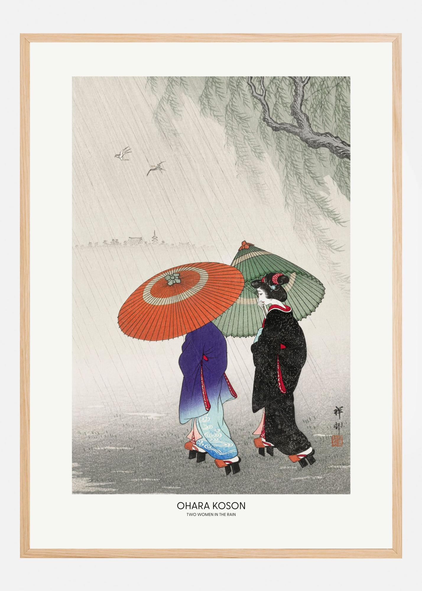 Denna poster visar ett elegant motiv av två kvinnor i regnet, skapad av den berömda konstnären Ohara Koson. Den avbildar en scen där kvinnorna promenerar med traditionella parasoller i subtila, stillsamma toner. En regnig bakgrund skapar en rofylld atmosfär och ger en känsla av tidlös skönhet och kultiverat lugn, perfekt för att komplettera en modern inredning eller en mer traditionell estetisk stil.