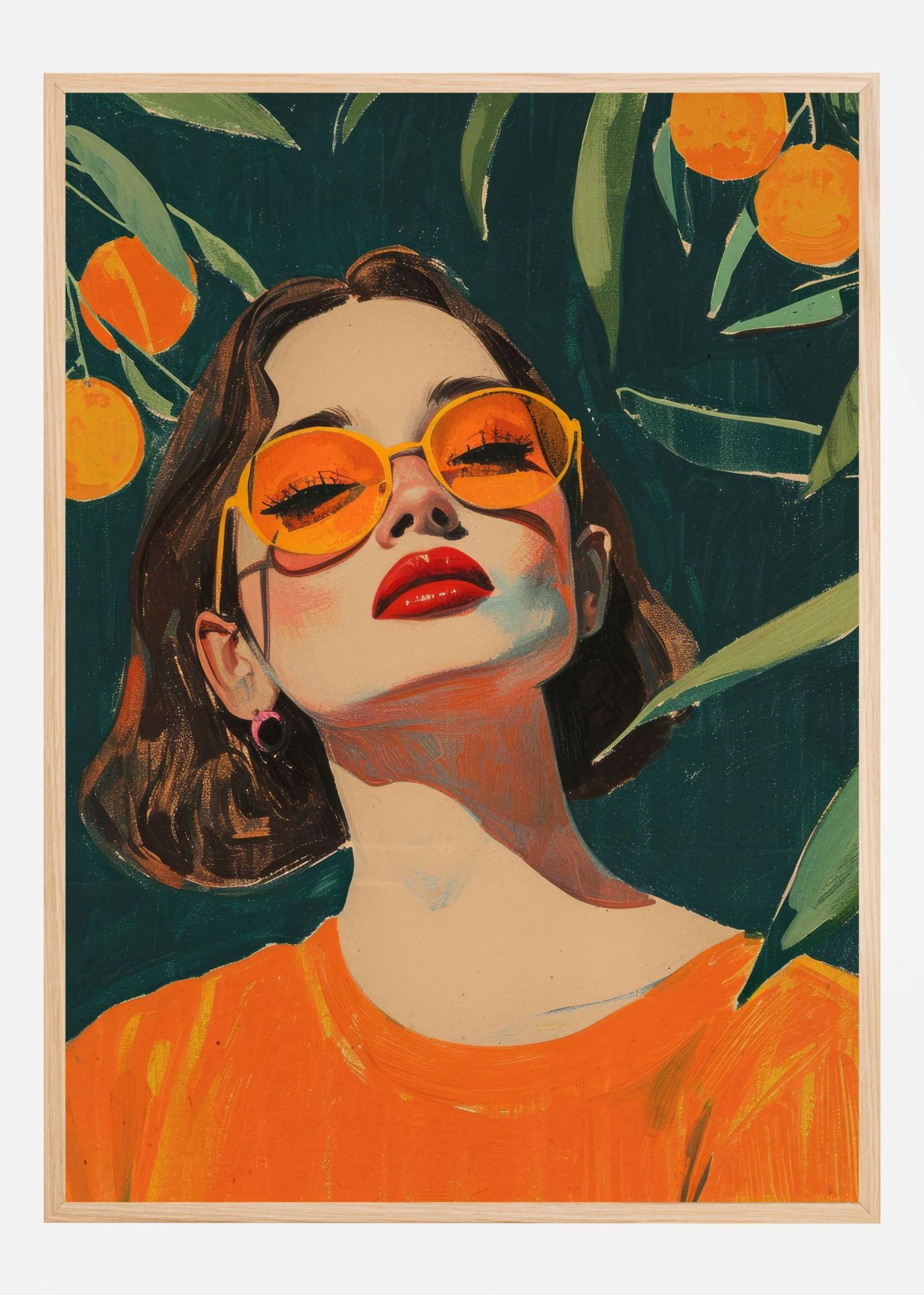 Denna färgstarka poster fångar essensen av modernitet och stil med en iögonfallande design. Motivet visar en kvinna med självförtroende, iklädd solglasögon i en härligt solig orange nyans, perfekt matchande med hennes läppar. Det är en print som enkelt blir ett samtalsämne och tillför en touch av elegans och uttrycksfullhet till vilket rum som helst.
