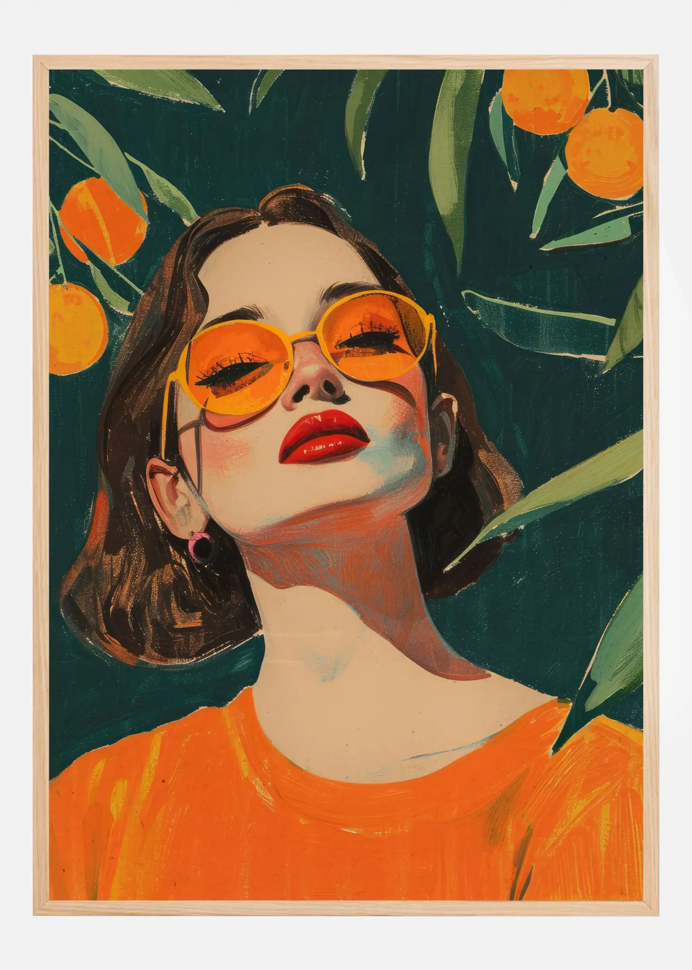 Färgpaletten i affischen är livfull och inkluderar djupa gröna toner som bakgrund, kontrasterat av fruktiga orangea inslag och varma nyanser av brunt och beige. Denna kombination ger en känsla av sommar och värme, vilket gör detta konstverk till ett potentiellt blickfång för alla inredningsmiljöer.