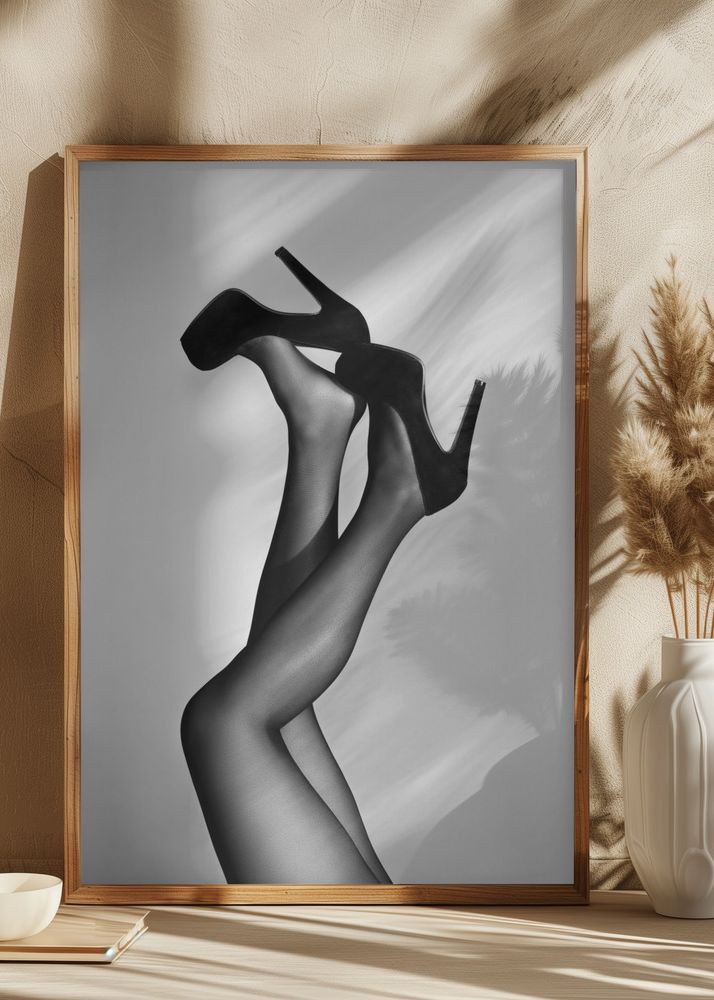 Denna stilrena affisch fångar elegans och sofistikering med sitt minimalistiska motiv av ett par ben klädda i svarta nätstrumpor och högklackade skor. Postern förmedlar en känsla av tidlös modeikonisk stil, vilket gör den perfekt för den som söker en chic och modern dekoration till sitt hem eller kontor. Med sin smakfulla presentation passar detta print i många olika inredningsstilar, från modern till klassisk.