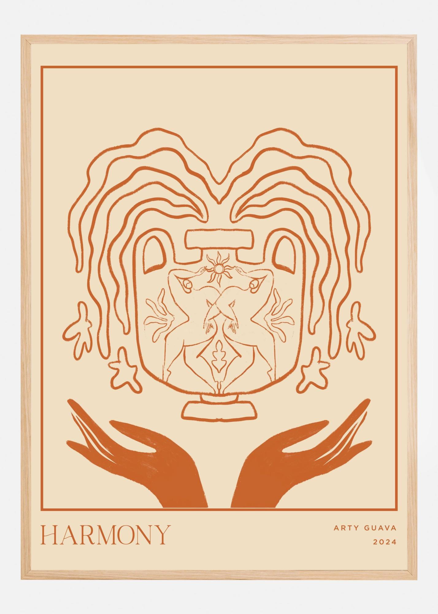 Denna konstfulla affisch, med titeln "Harmony", ger ett elegant och balanserat uttryck som fångar ögat. Motivet centreras kring en stiliserad vas med flera ansikten och omgivande dekorativa element som för tankarna till naturen och dess harmoniska flöden. Händers former nedtill förmedlar en känsla av trygghet och balans, vilket gör denna poster till ett underbart tillskott i alla hem och miljöer där lugn och ro önskas.