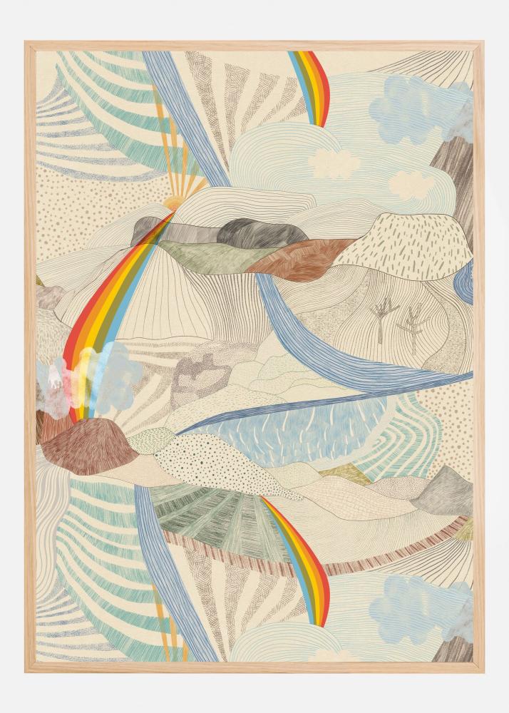 Motivet domineras av nyanser av blått, beige och grönt, medan regnbågens livfulla röda, gula och oranga färger skapar kontrasterande accenter. Små detaljer i grått och brunt förstärker landskapets texturer och ger affischen en naturlig och drömliknande känsla. Denna poster är perfekt för dem som vill lägga till en konstnärlig och trendig touch till sin inredning.