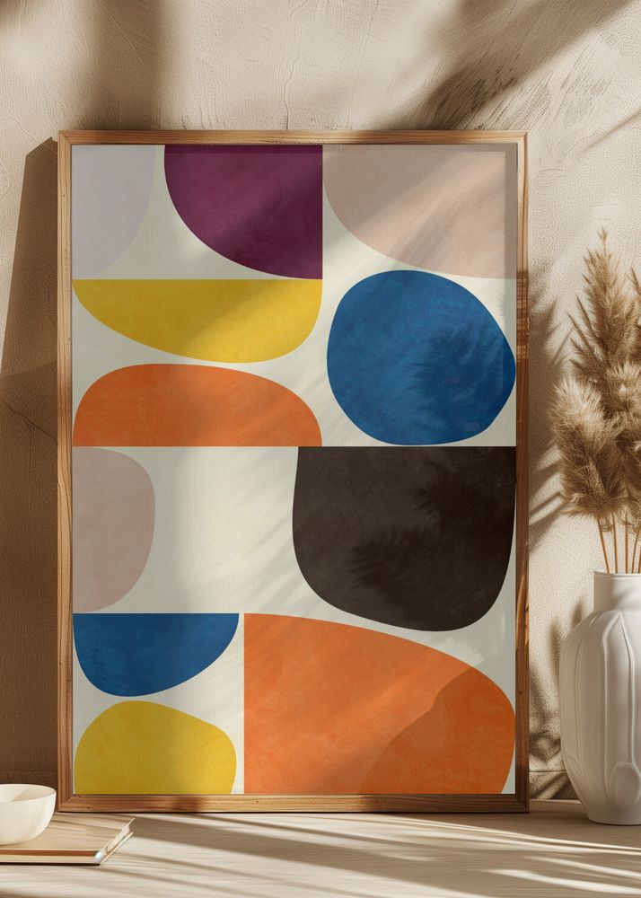 Denna moderna poster med abstrakta former och klara färger är perfekt för att ge liv åt vilket rum som helst. Här sammanflätas nyanser av djupblått, klart orange och intensivt gult med jordiga toner av beige och mörkbrunt. Denna print är ett utmärkt val för den som söker en färgstark och trendig affisch som utstrålar både energi och stilren design.