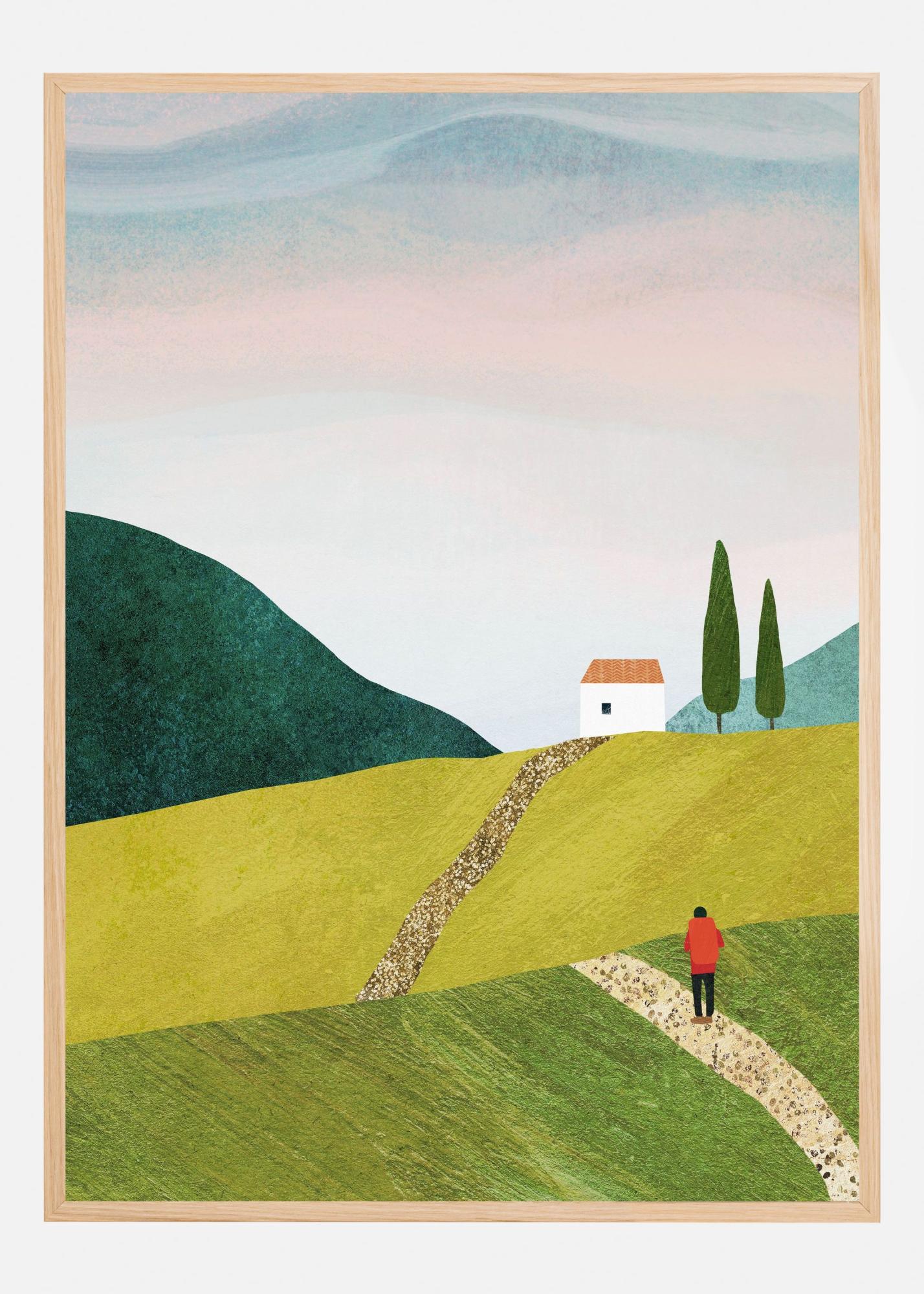 Denna poster skildrar ett pittoreskt landskap med mjuka, böljande kullar i gröna nyanser. I motivet ser vi en person klädd i en röd jacka som promenerar längs en stenig stig, vilket ger en känsla av rörelse och äventyr. En liten vit stuga med ett rött tak står charmigt placerad i bakgrunden, flankerad av två ståtliga träd.