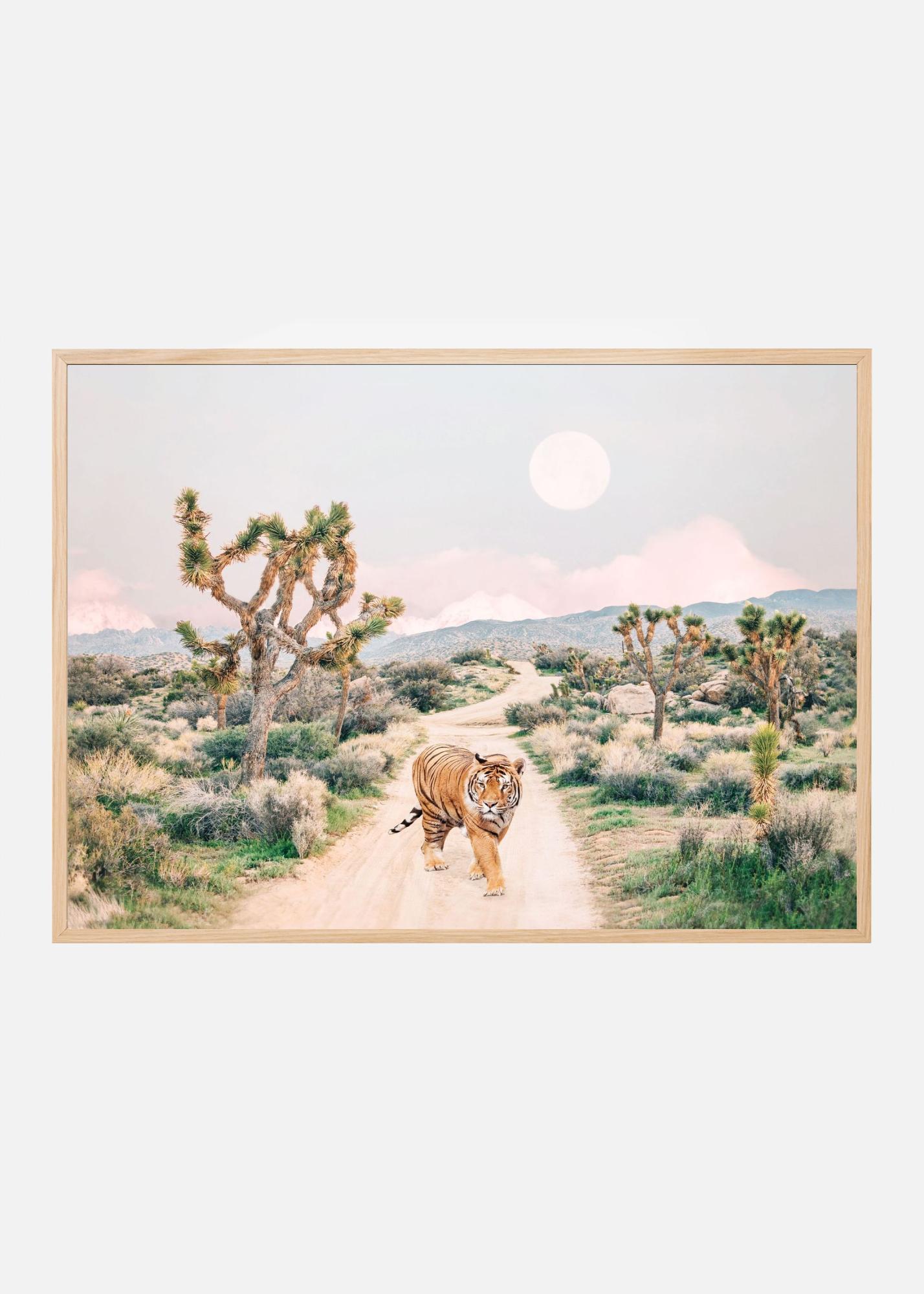 Denna poster fångar en majestätisk tiger som strosar genom ett kargt ökenlandskap med majestätiska träd och berg i bakgrunden. Den fullständiga månen hänger över horisonten och skänker en magisk känsla till scenen. Denna print är perfekt för djurälskare och naturentusiaster som söker en unik affisch att pryda sina väggar med.