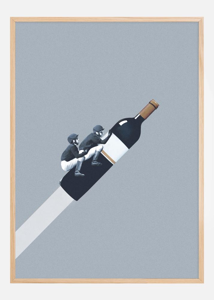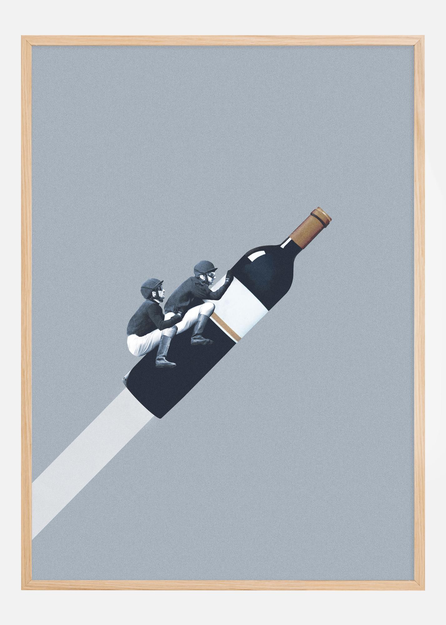 Färgschemat är dämpat men uttrycksfullt, där de svala blå nyanserna i bakgrunden kompletterar de mörkare tonerna av ridkläderna och den djupa svärta på vinflaskan. Den kombinerar en modern estetik med en känsla av nostalgi, vilket gör denna affisch till en perfekt konstnärlig touch i hem som uppskattar en blandning av tradition och humor. Det är en samtida tolkning av att rida ut stormen, vilket ger ett stilfullt och samtidigt humoristiskt inslag i vilket rum som helst.