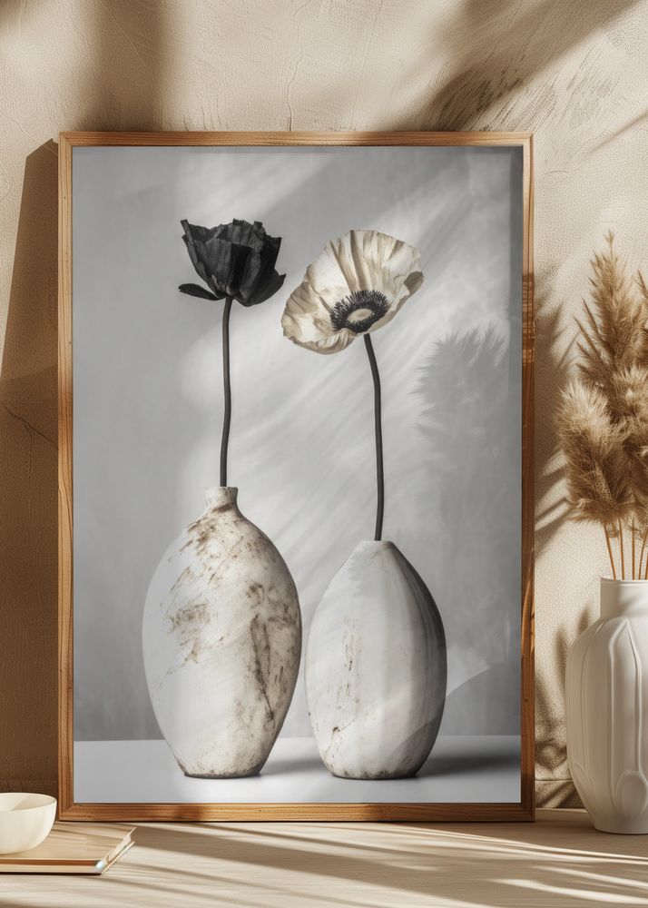 Denna stilrena poster visar två eleganta vaser med blommor som utstrålar tidlös skönhet och enkelhet. Med en subtil palett av svart, beige och vita nyanser skapar denna print en lugn och sofistikerad estetik som passar utmärkt i både moderna och klassiska interiörer.