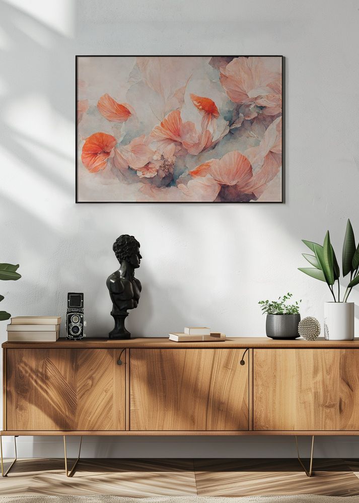 Denna vackra affisch fångar essensen av ett mjukt och drömlikt blommotiv, där orange och korallfärgade blommor tar centrum. Blommorna flyter på en subtil bakgrund av ljusblå och beige nyanser, vilket ger en lugn och harmonisk känsla. Posterens konstnärliga stil gör den perfekt för att tillföra en touch av elegans och färg till vilket rum som helst.