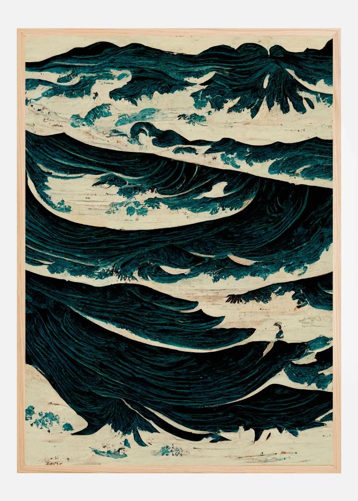 Målningen består av mörkblå och turkosa toner som elegant blandas med svarta inslag, vilket ytterligare förstärker vågornas dramatiska effekt. Dessa färger gör att affischen enkelt kan kombineras med modern inredning och andra dekorativa prints. Denna affisch är ett utmärkt val för att ge ditt utrymme ett stilfullt och konstnärligt uttryck.