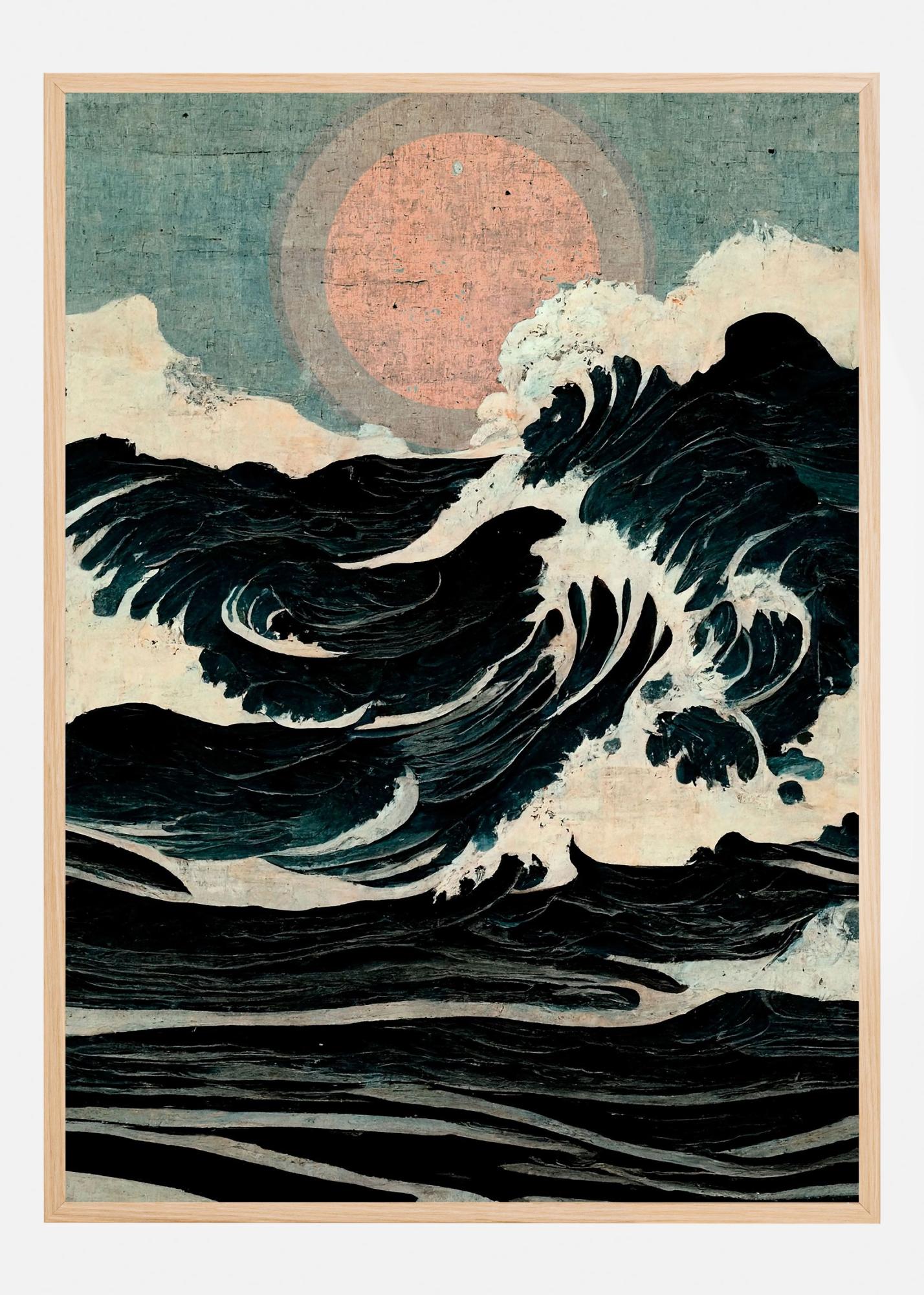 Färgpaletten i denna poster består av olika nyanser av blått och svart som används för att skildra djupet och kraften hos vågen, medan bakgrunden har varma toner av beige och rosa som framhäver himmelens och solens mjukhet. Den harmoniska kombinationen av färger gör detta print till ett iögonfallande tillskott i vilket rum som helst, perfekt för att skapa en avslappnad och ändå livfull stämning.