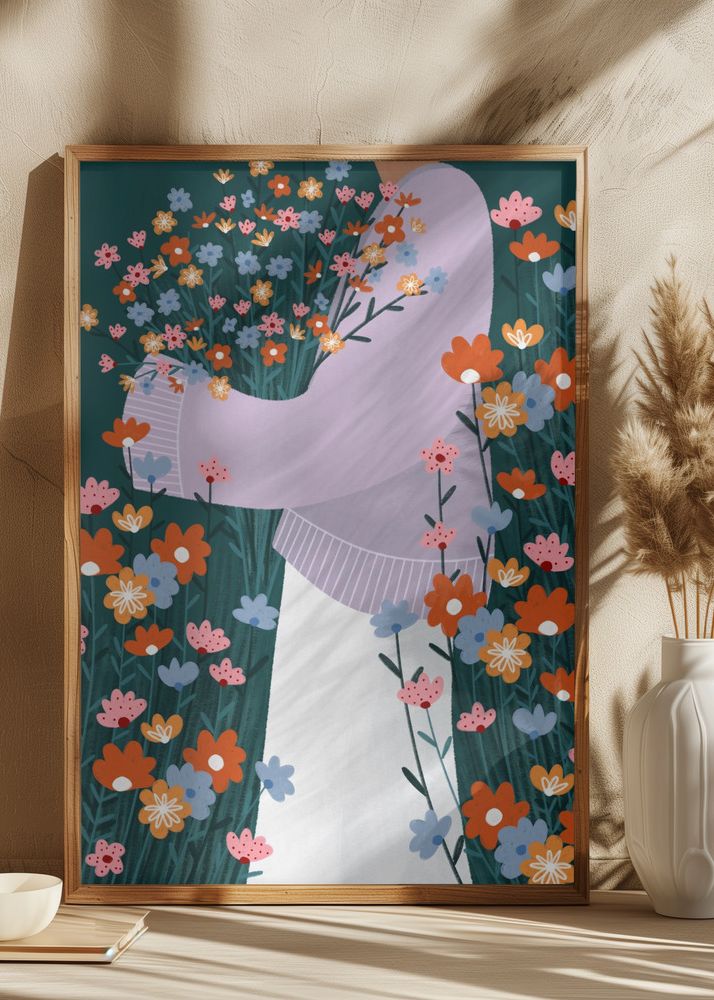 Affischen har en harmonisk blandning av färger där den djupa gröna bakgrunden kontrasterar med mjuka pasteller och starka blommiga toner. Den lavendelfärgade tröjan står i fin balans med de älskvärda blommorna i röda, orange och blå nyanser, vilket ger en modern touch till ditt hem. Perfekt som print för att lysa upp vilken vägg som helst.